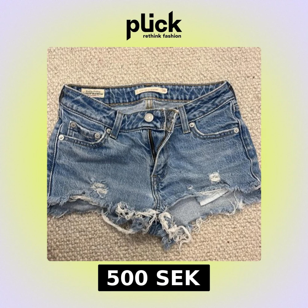 Säljer ett par ljusblå jeansshorts från Levi's med låg midja och rak passform. Shortsen har slitna detaljer, fransig rå kant och klassiska fem fickor. Perfekta för sommaren och ger en avslappnad vibe.