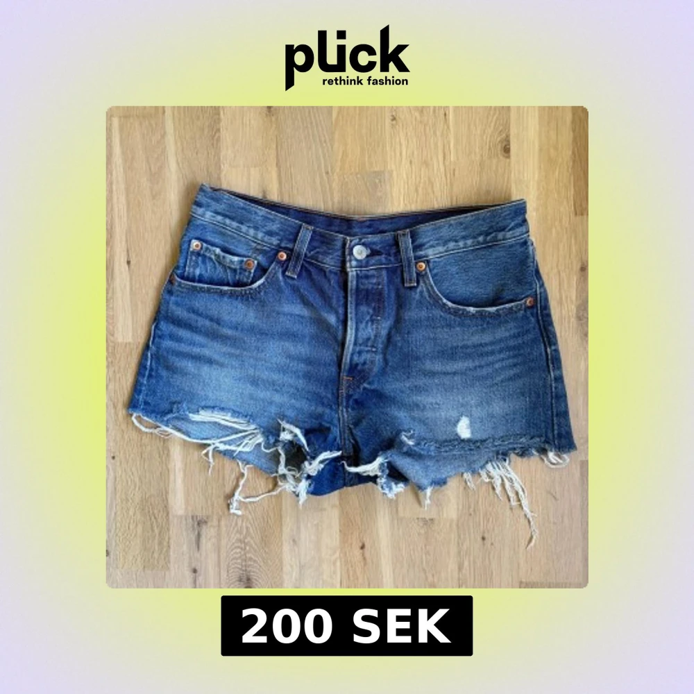 Klassiska blå Levi's 501 jeansshorts med fransig kant. Medium midhöjd. Passar S, W27. Skriv om du har frågor om plagget!