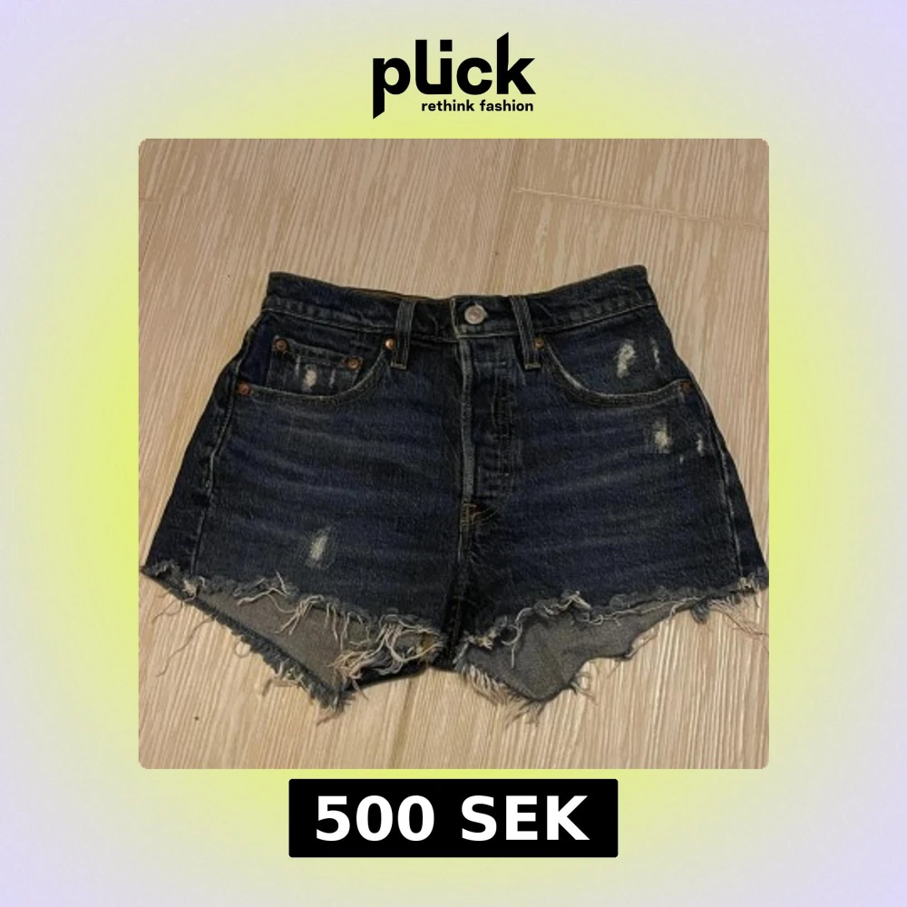 Säljer ett par mörkblå jeansshorts från Levi's 501 med fransig kant och slitna detaljer. Klassisk femficksmodell med låg midja. Perfekta för en avslappnad stil. De är i bra skick, är nya och har inte används. Storlek W24