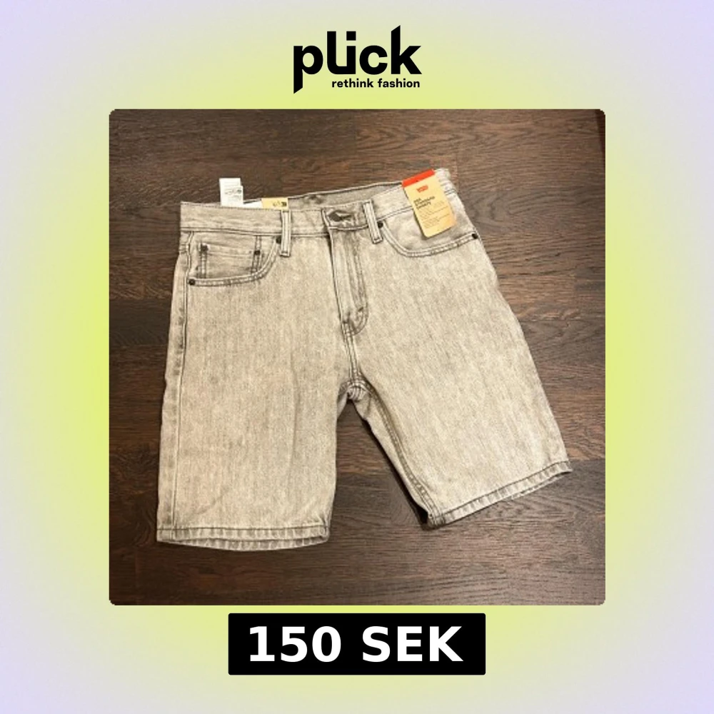 Säljer ett par grå jeansshorts från Levi's, modell 405 Standard. De är tillverkade i 100% bomull och har en klassisk femficksdesign. Perfekta för en avslappnad stil med en normal passform och midwaist. Levi's-loggan syns tydligt på baksidan.