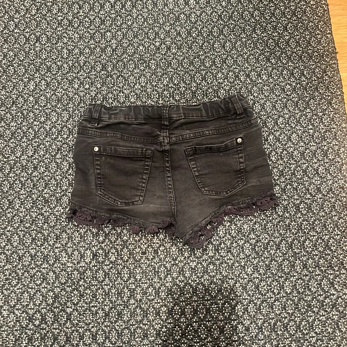 Snygga svarta jeansshorts med spetsdetaljer längst ner. Perfekta för en cool och avslappnad stil. Shortsen har fickor både fram och bak samt en knapp och dragkedja framtill.