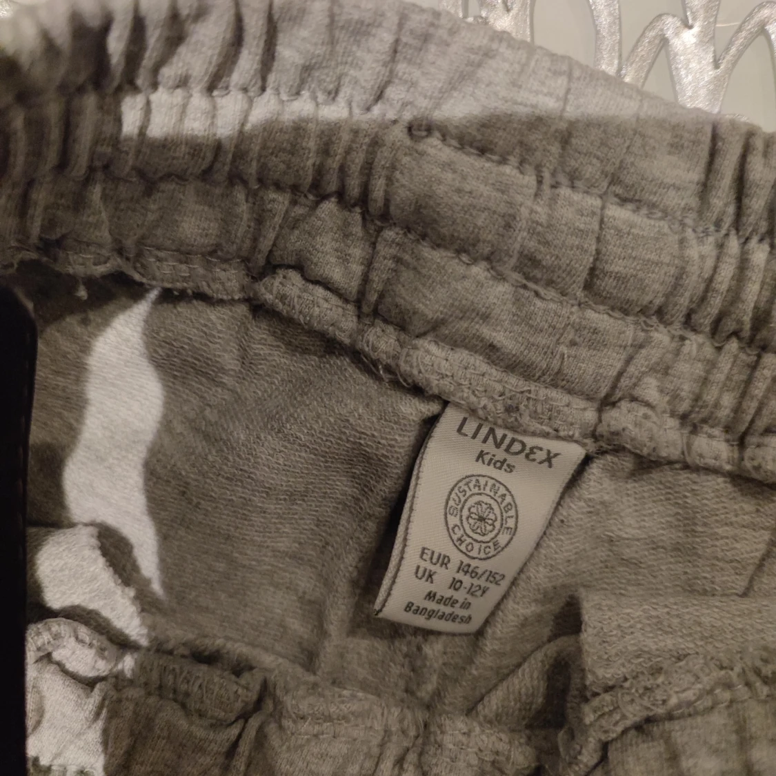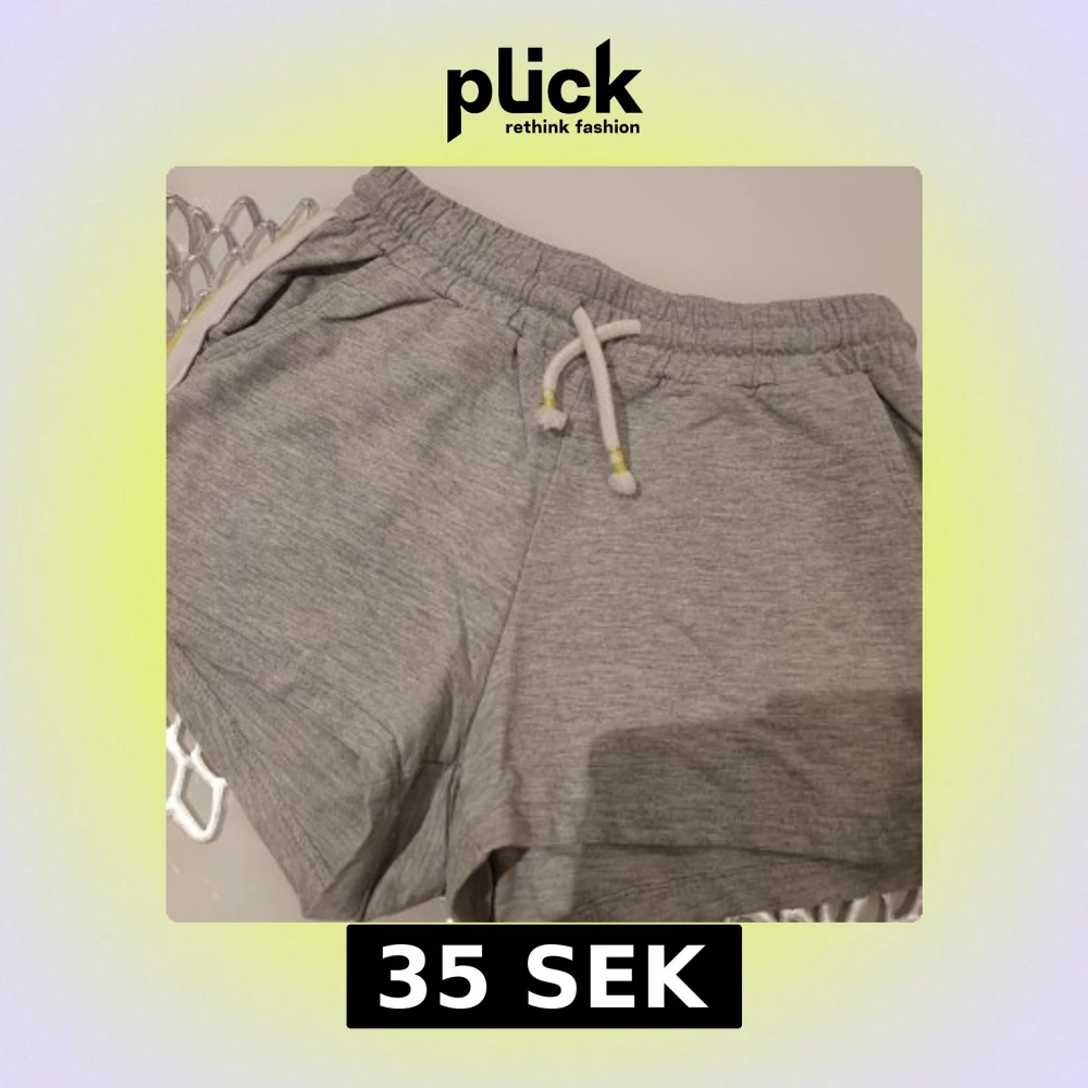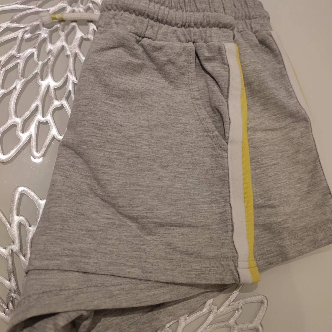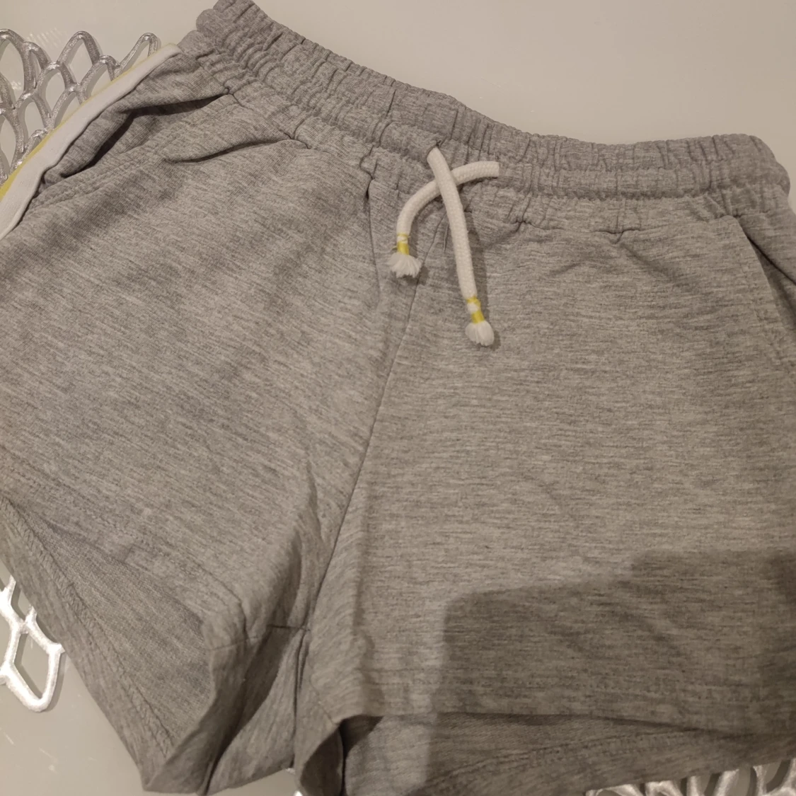 Snygga grå shorts från Lindex med elastisk midja och snörning. De har en vit och gul rand på sidan som ger en sportig look. Perfekta för en avslappnad stil.