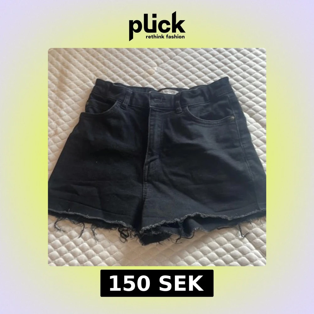 Svarta jeansshorts från Lindex med hög midja och råa, fransiga benslut. Klassisk femficksmodell med bälteshällor och dragkedja. Perfekta för en chill sommarlook och lätta att matcha med allt.