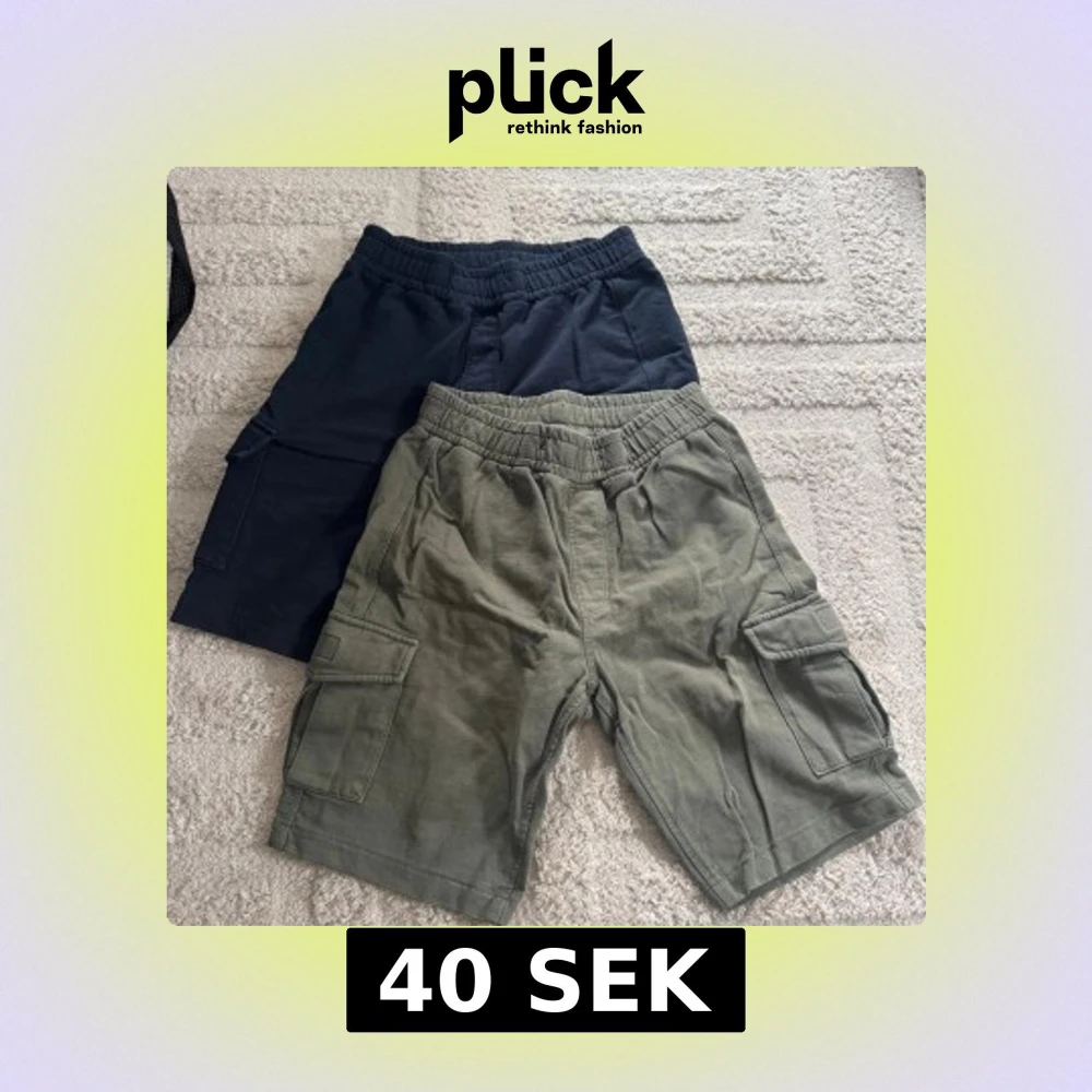 Två par cargo shorts från Lindex i storlek 122/128. Ett par är mörkblå och det andra är olivgröna, båda med elastisk midja och stora sidofickor. Perfekta för sommardagar och lek, tillverkade i mjuk bomull för extra komfort.