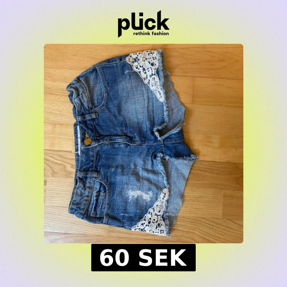 Säljer ett par blå jeansshorts med råa kanter och vita spetsdetaljer i hörnen. Shortsen har klassisk femficksdesign, knapp och dragkedja framtill samt snyggt slitna partier. Perfekta för sommaren och ger en cool, avslappnad vibe.