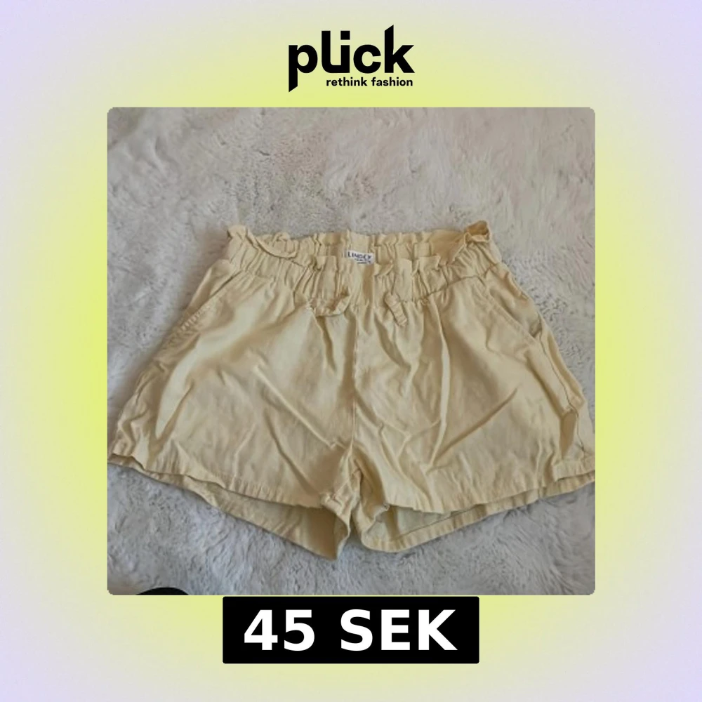 Säljer ett par ljusgula shorts från Lindex med elastisk midja och volangkant upptill. Shortsen har fickor på sidorna och är tillverkade i ett mjukt bomullsmaterial. Perfekta för varma dagar!