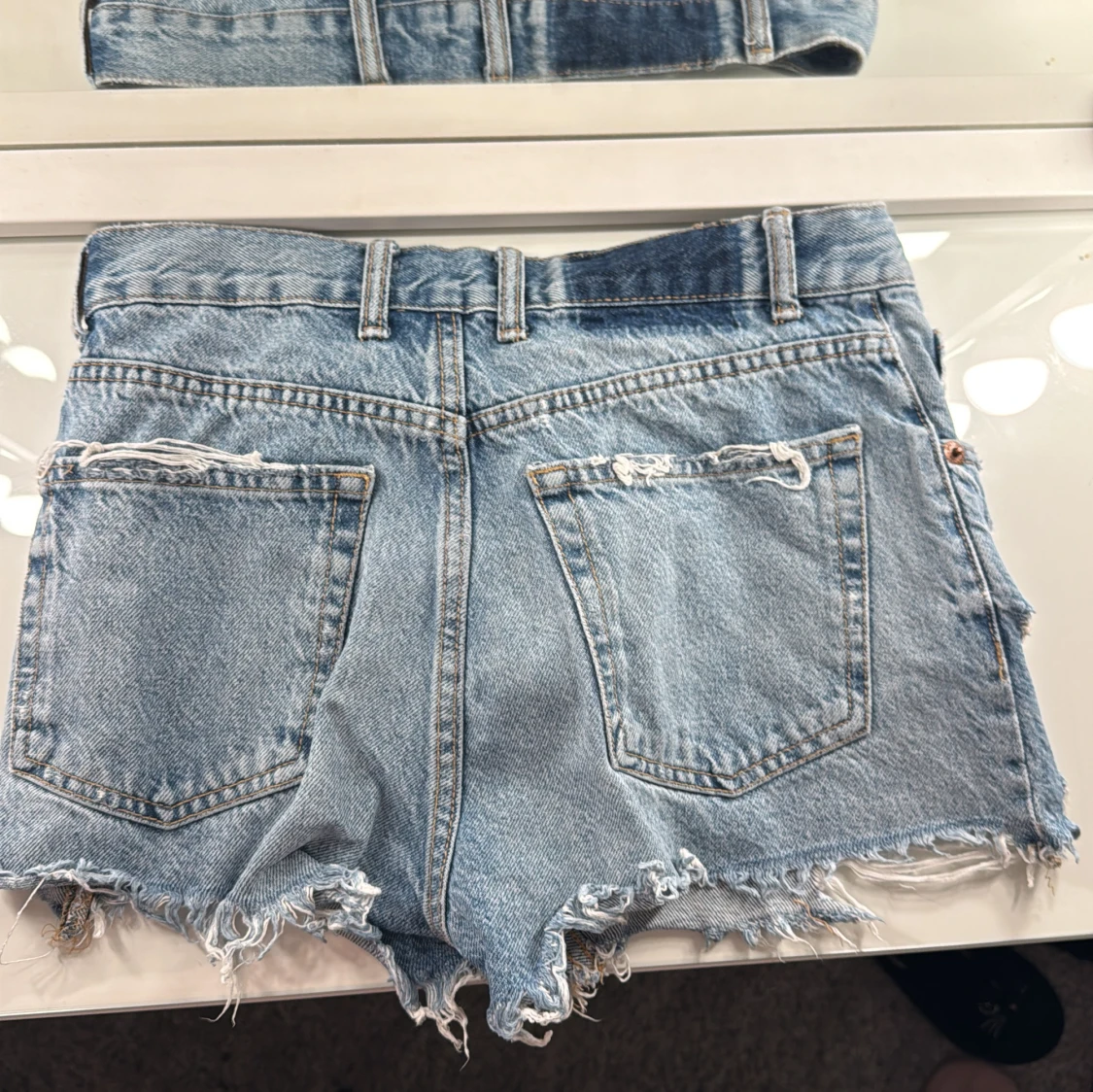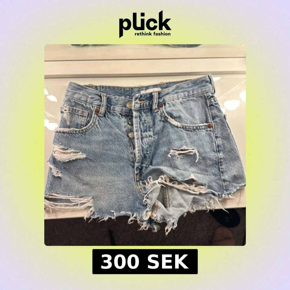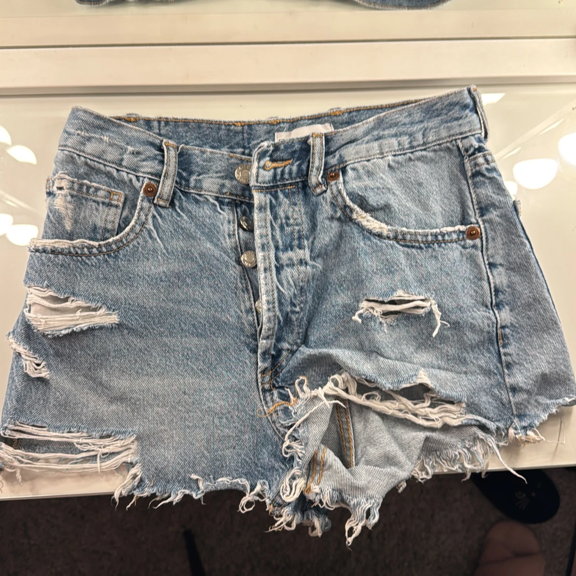 Säljer ett par ljusa jeansshorts med coola slitningar och fransiga kanter. Shortsen har en klassisk femficksdesign och knappar framtill. Perfekta för en avslappnad stil!