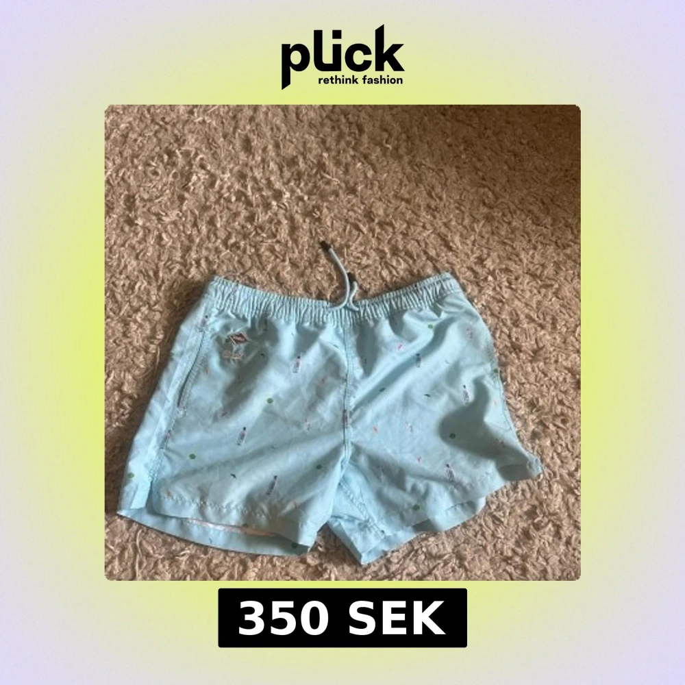 Snygga ljusblå badshorts från Nikben x Caliroots med drinkmönster och små färgglada detaljer. Shortsen har elastisk midja med snörning och innerbyxa i mesh. Aldrig använda pga storlek!
