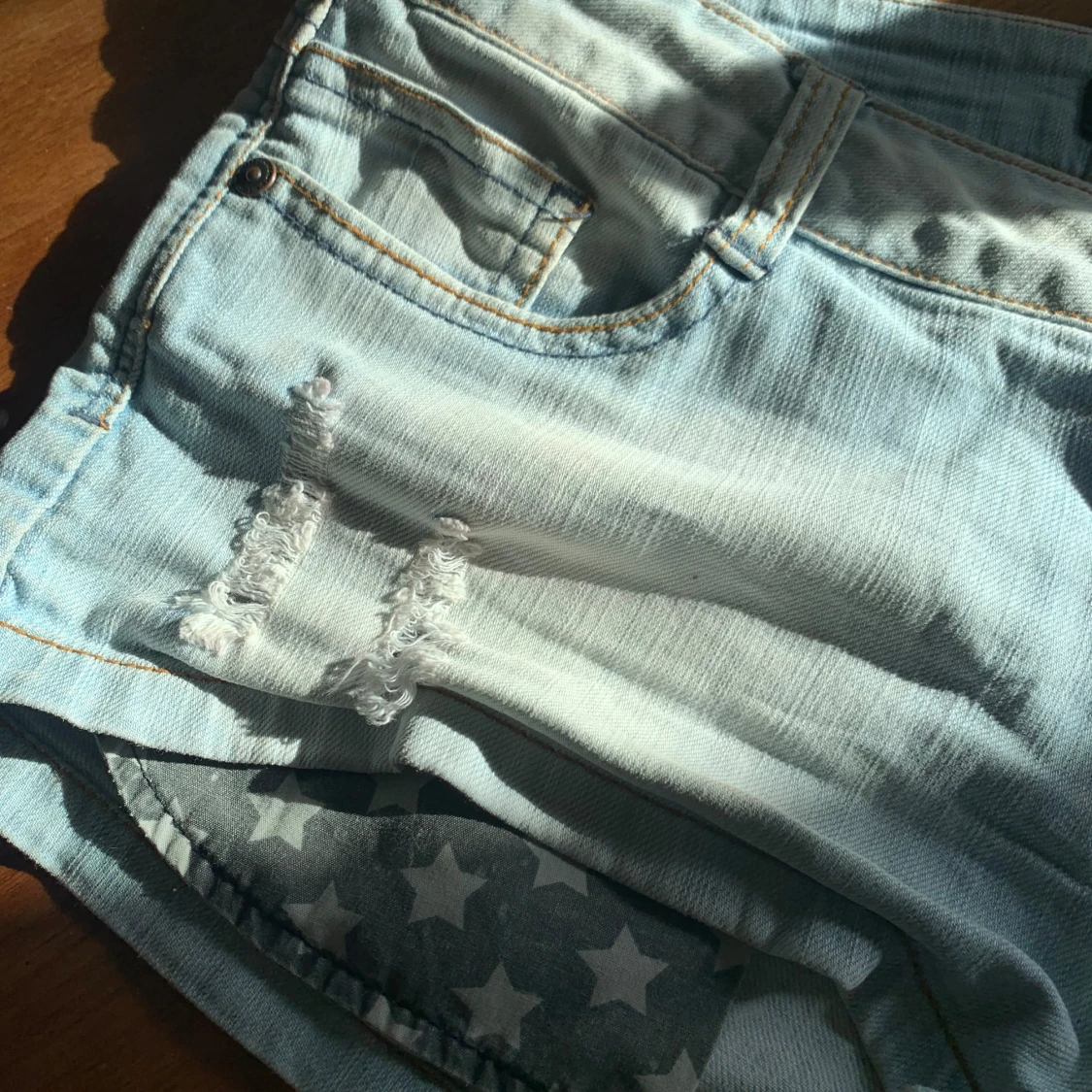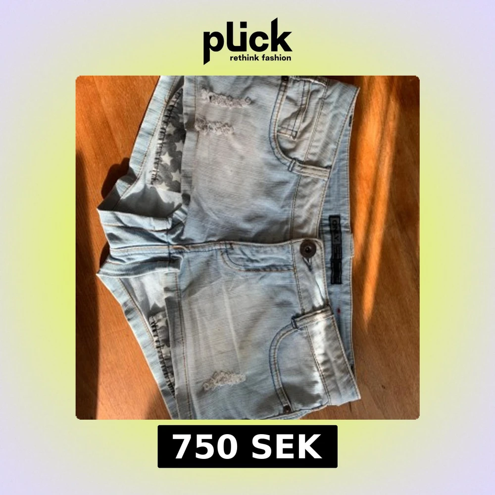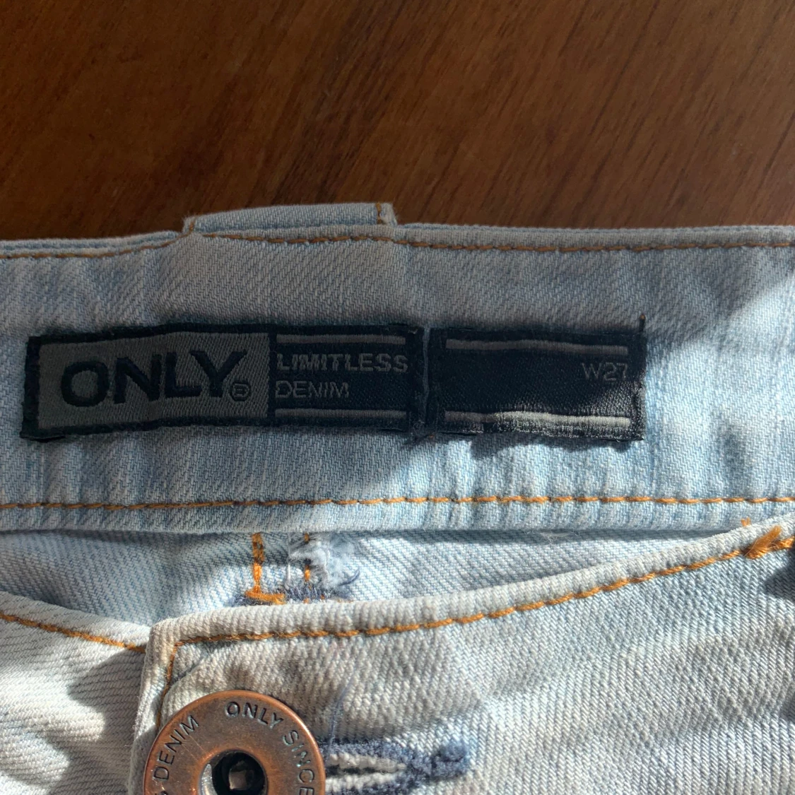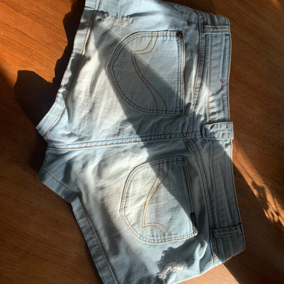 Säljer ett par ljusblå denimshorts från ONLY med slitna detaljer framtill och klassiska fem fickor. Shortsen har låg midja och coola stjärnor på fickfodret. Perfekta för varma dagar och en avslappnad stil.