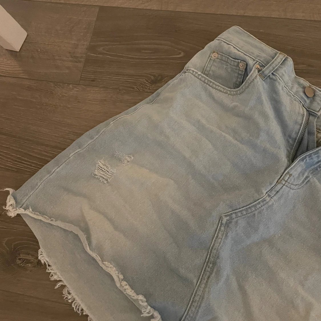 Säljer en ljus blå kjol från Dr Denim med råa, fransiga kanter och slitningar framtill. Klassisk femficksmodell och hög midja. Perfekta för sommaren och ger en avslappnad vibe.
