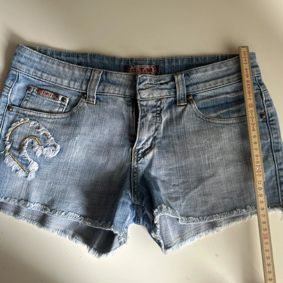 Snygga ljusblå jeansshorts från C.T.M med fransig kant och klassisk femficksdesign. Shortsen har en broderad och sliten C-detalj på ena fickan och coola slitningar för en avslappnad vibe. Perfekta för varma dagar och chill häng.
