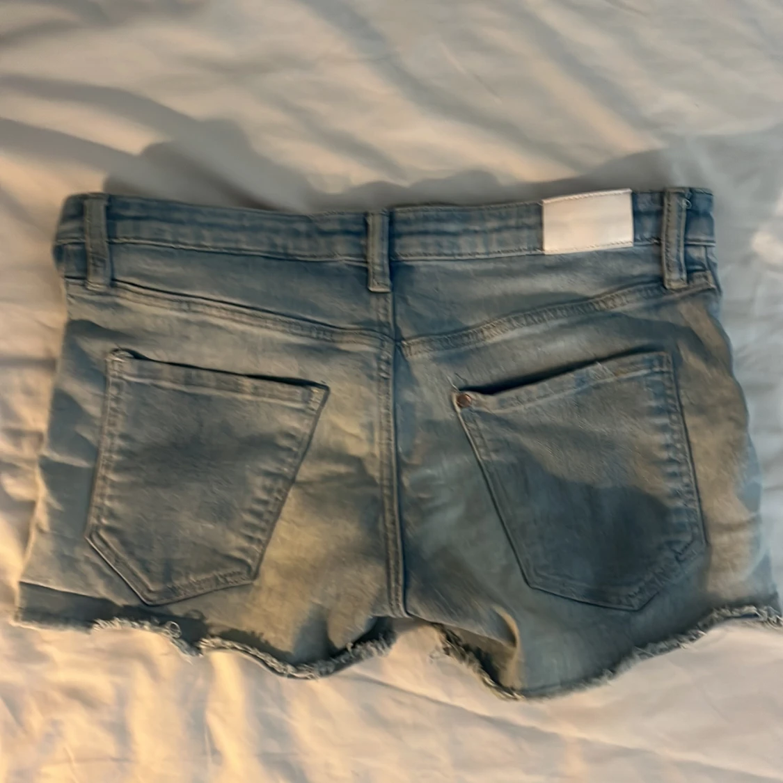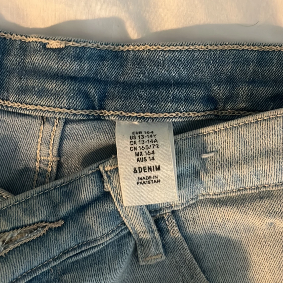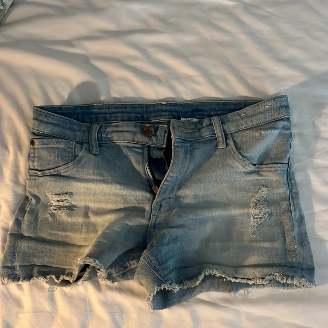 Säljer ett par ljusblå jeansshorts från &Denim i storlek 164. De har slitna detaljer på framsidan, Perfekta för sommaren och ger en avslappnad vibe. Passar dig som gillar en casual och trendig look.
