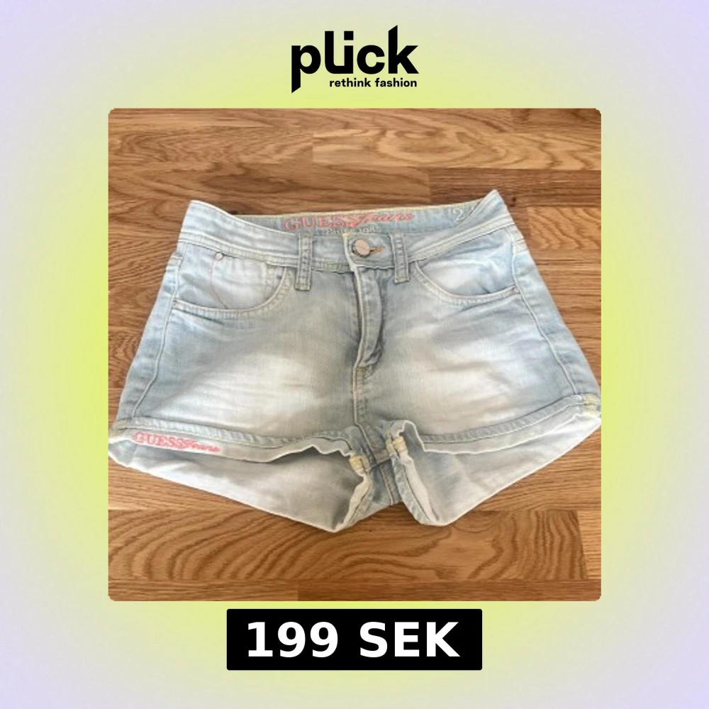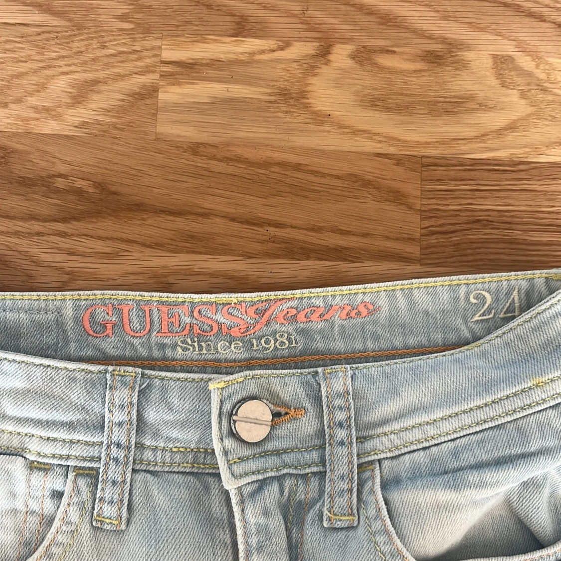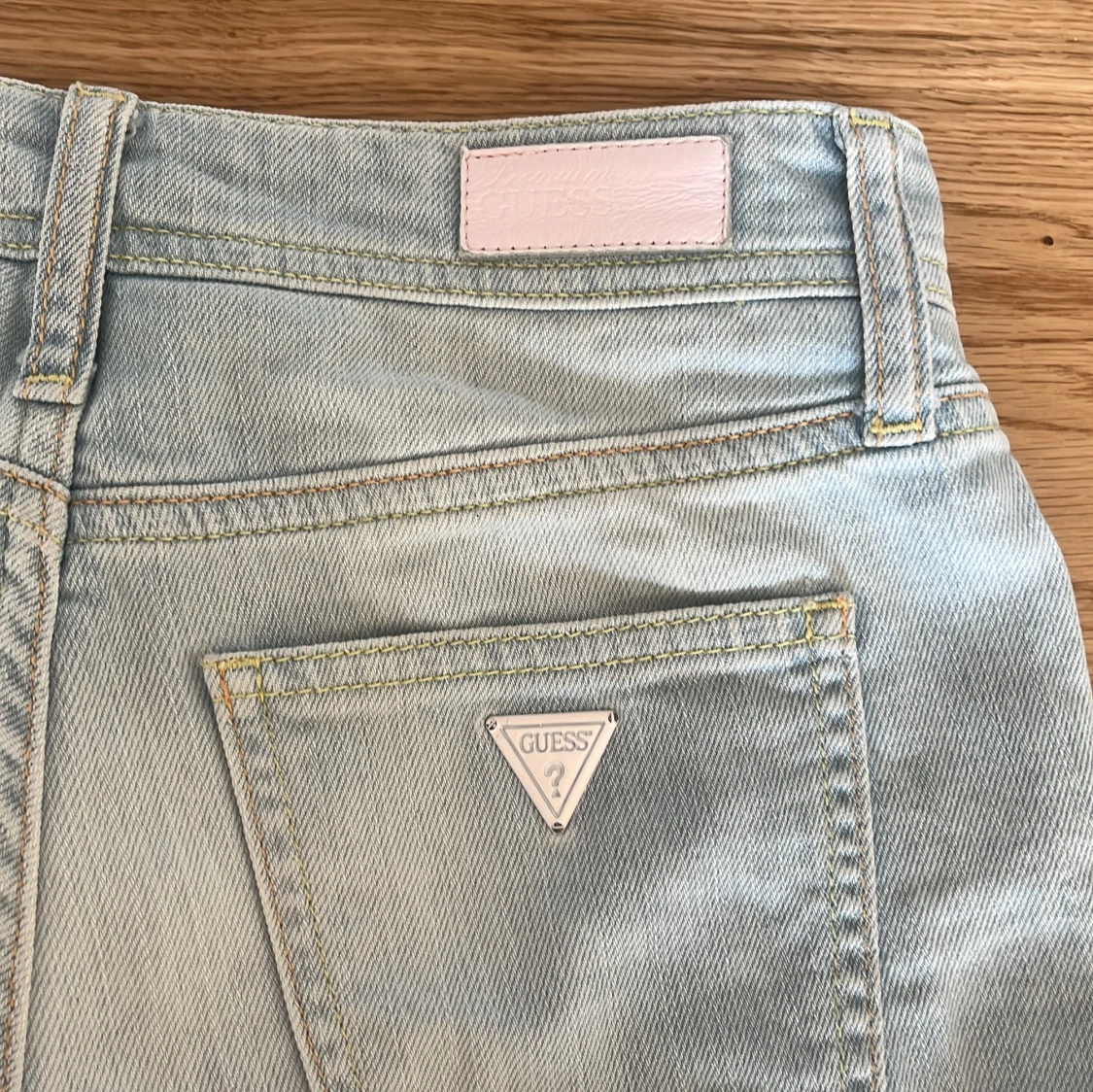 Säljer ett par ljusblå jeansshorts från Guess med klassisk femficksdesign och uppvikta benslut. Shortsen har broderad logga i rosa och vit på linningen och bakfickan, samt knapp och dragkedja framtill. ( midjemått 64cm) säljer då de va för små