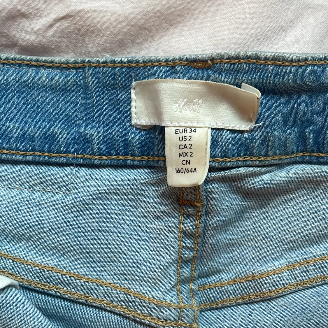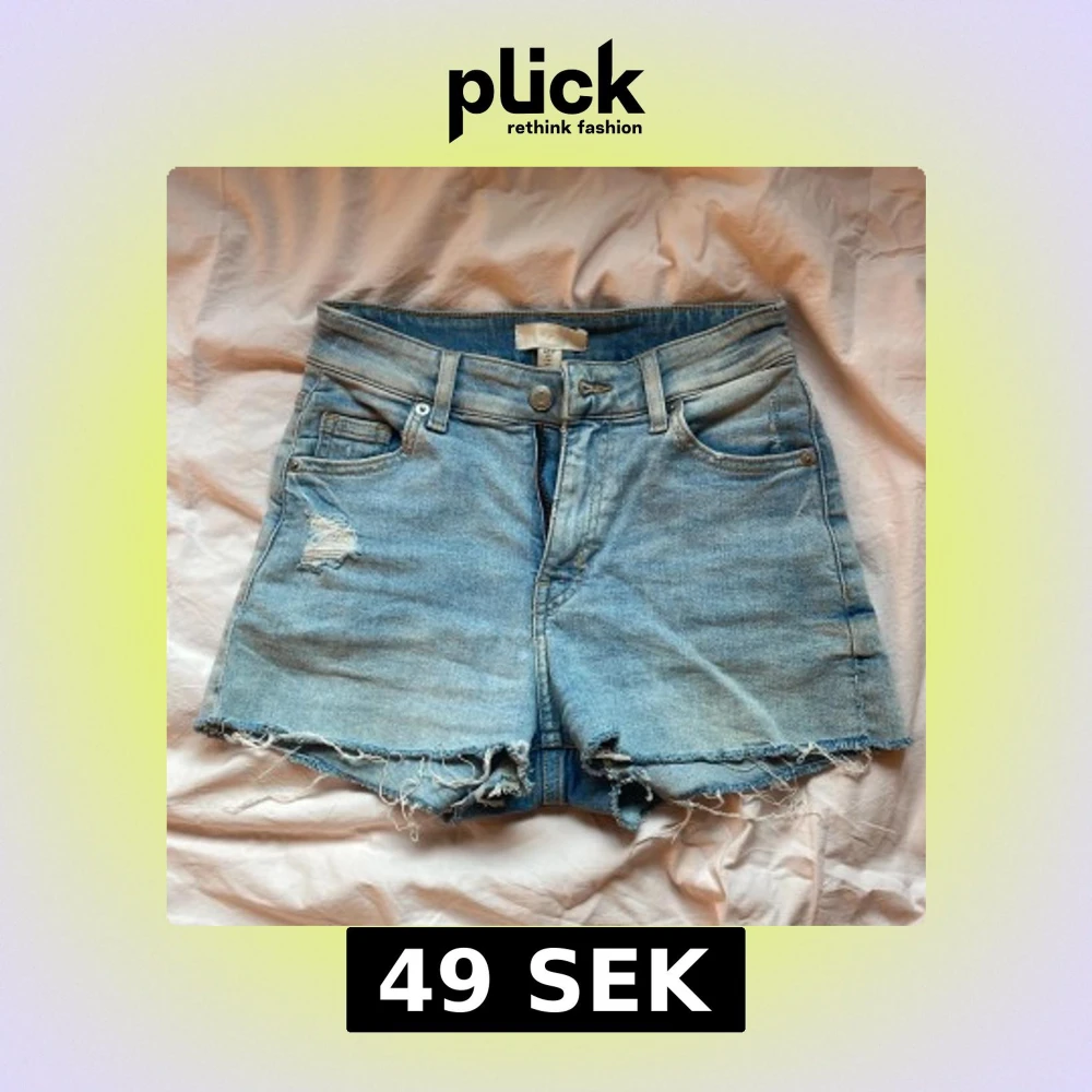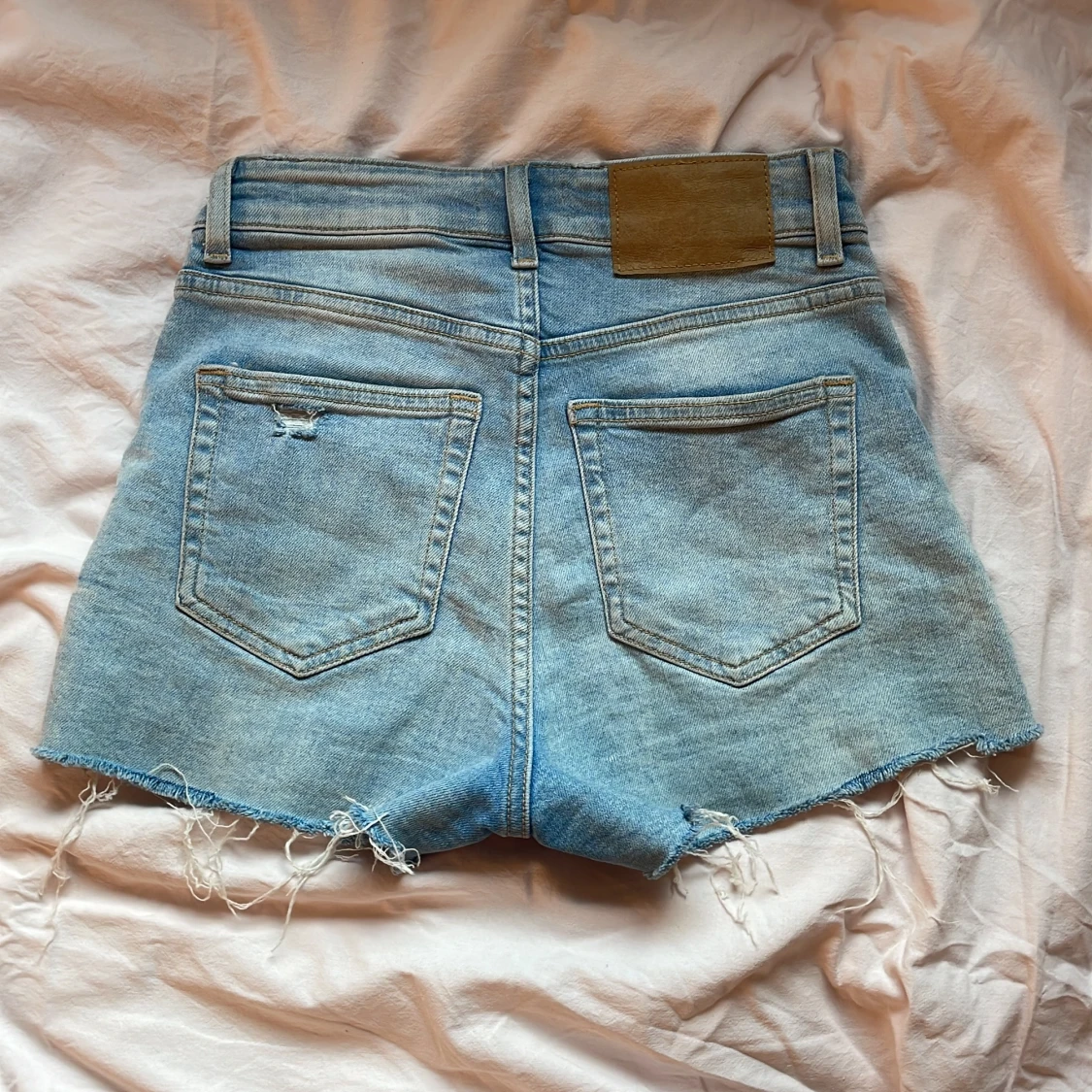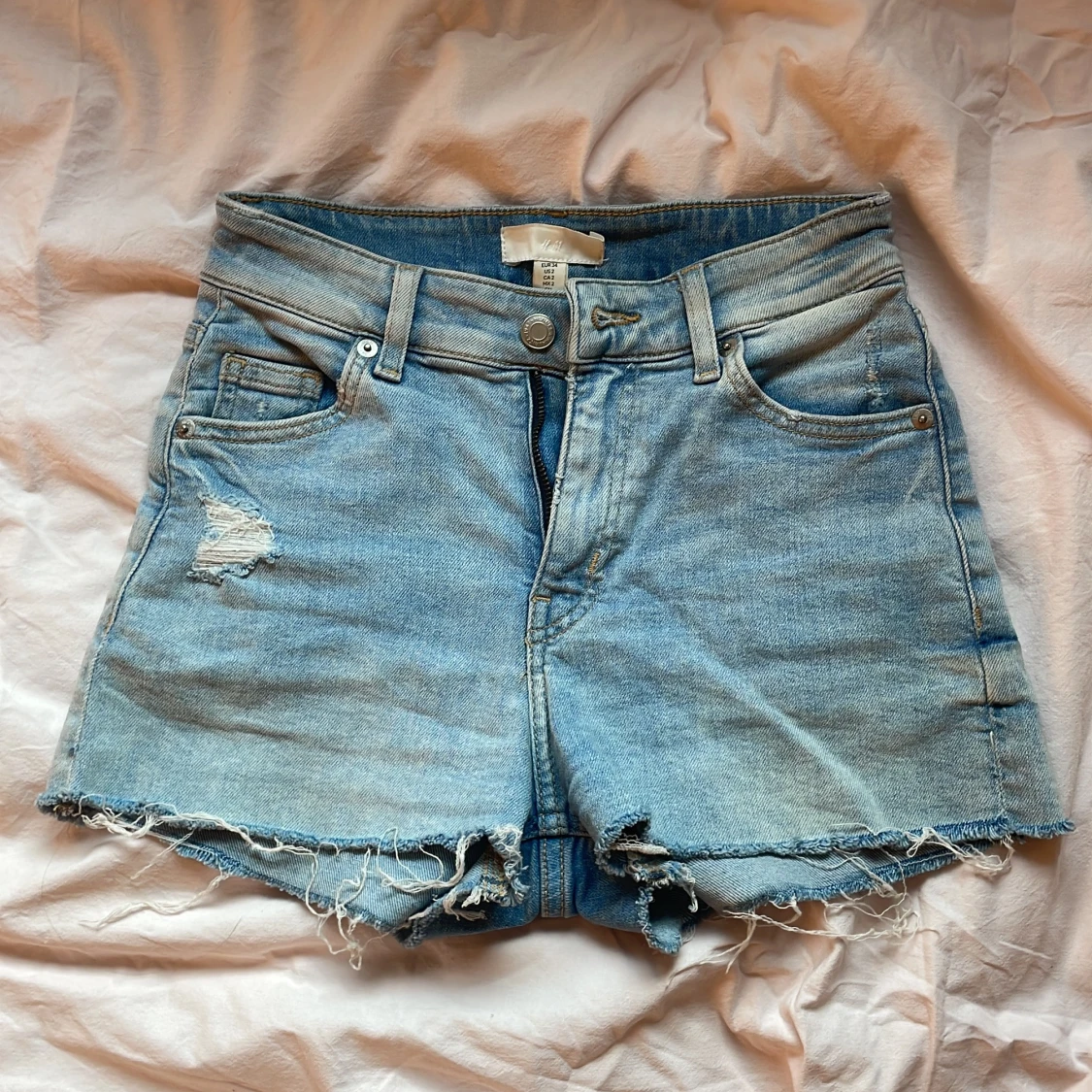 Ljusblå jeansshorts från H&M med hög midja och råa, fransiga kanter. Shortsen har slitna detaljer både fram och bak, klassiska fem fickor och dragkedja med knapp. Bra skick och stretchigt material🤗