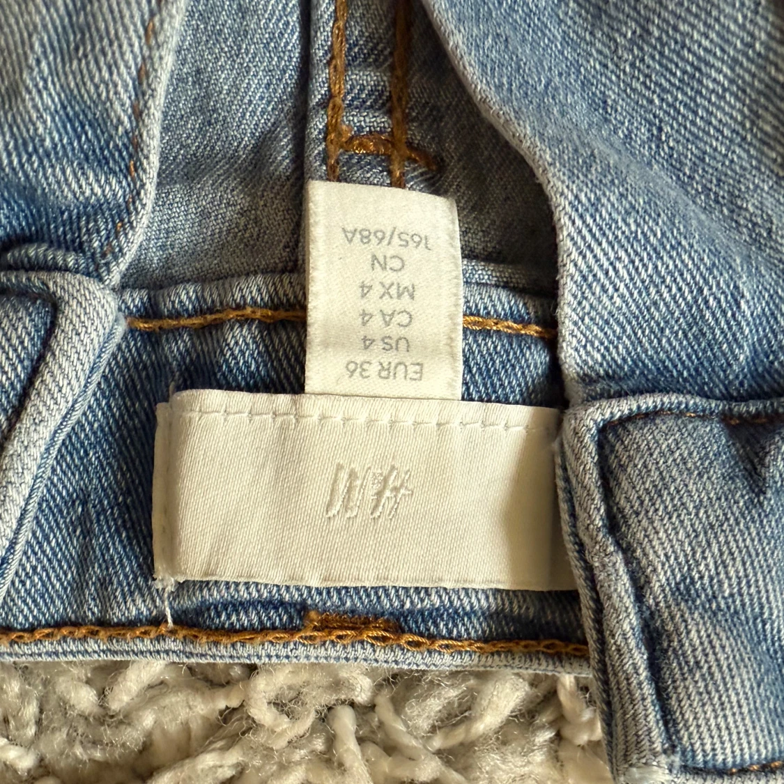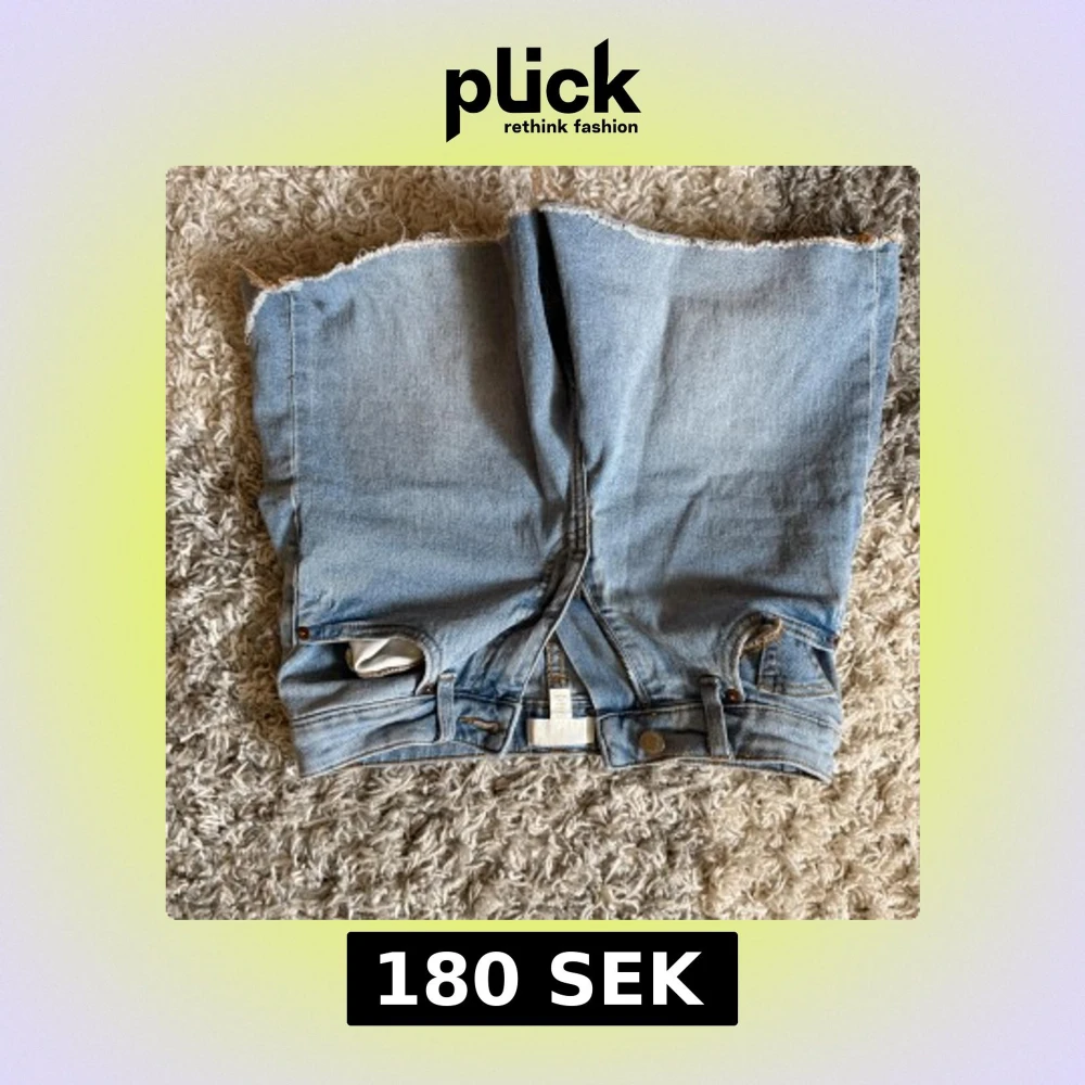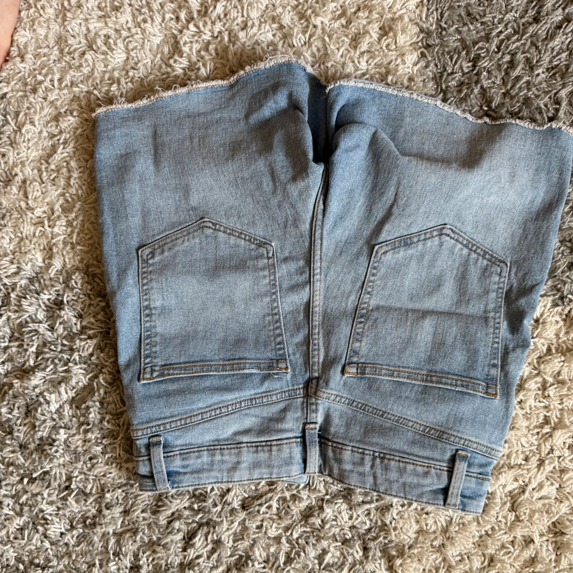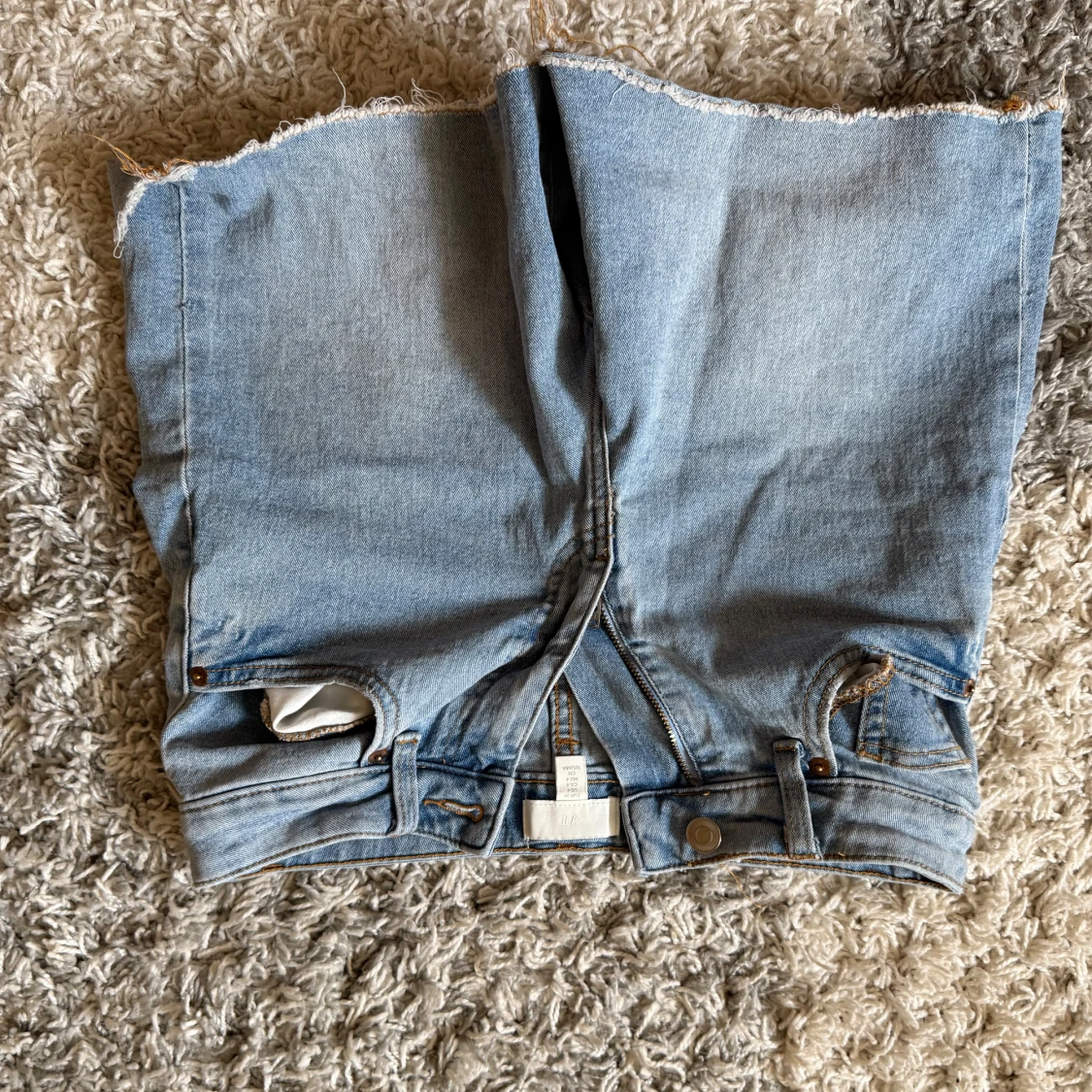 Säljer ett par ljusblå jeansshorts från H&M i klassisk denim med råa, fransiga benslut. Shortsen har femficksdesign, bälteshällor och dragkedja med knapp. Perfekta för en chill sommarlook.
