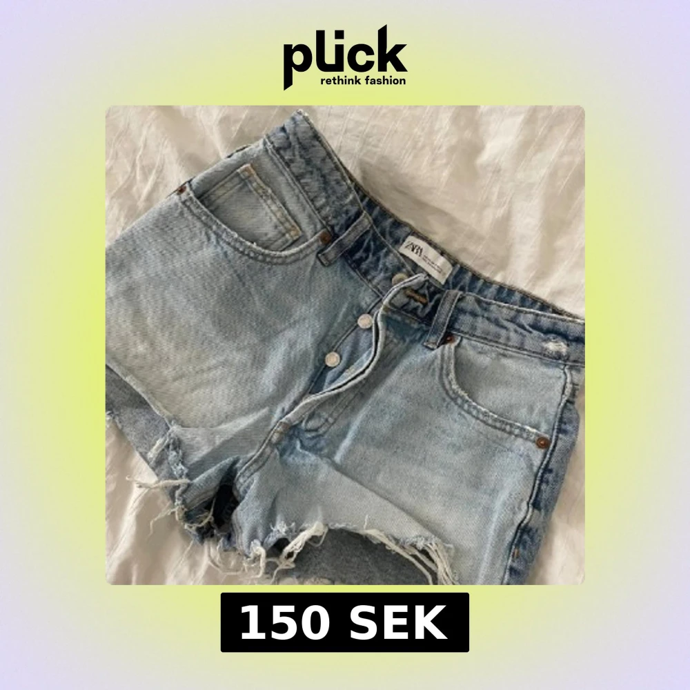 Säljer ett par ljusblå jeansshorts från Zara i klassisk femficksmodell. Shortsen har råa, fransiga benslut och slitningar på bakfickan för en cool, avslappnad look. Perfekta för varma dagar och enkel att matcha med allt.