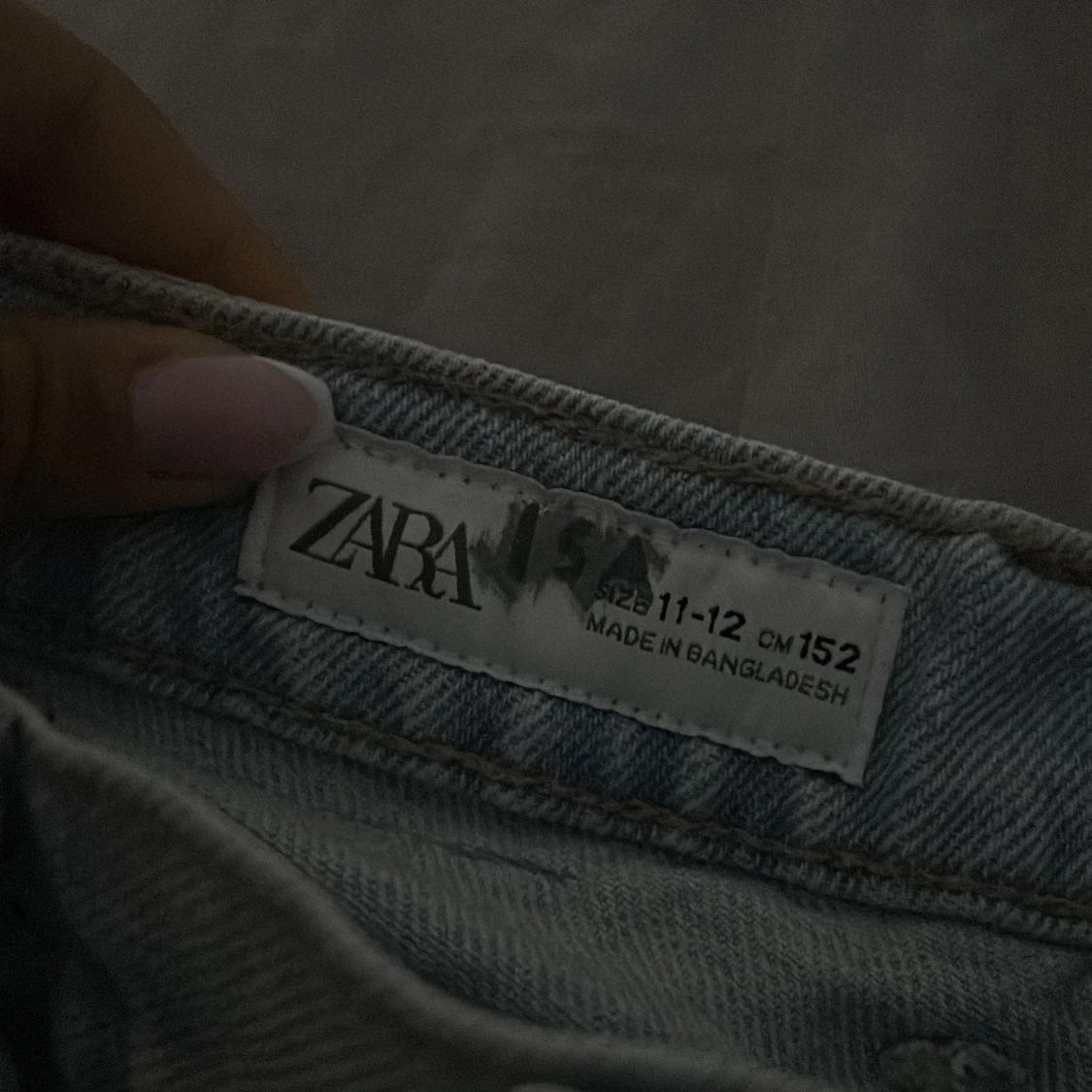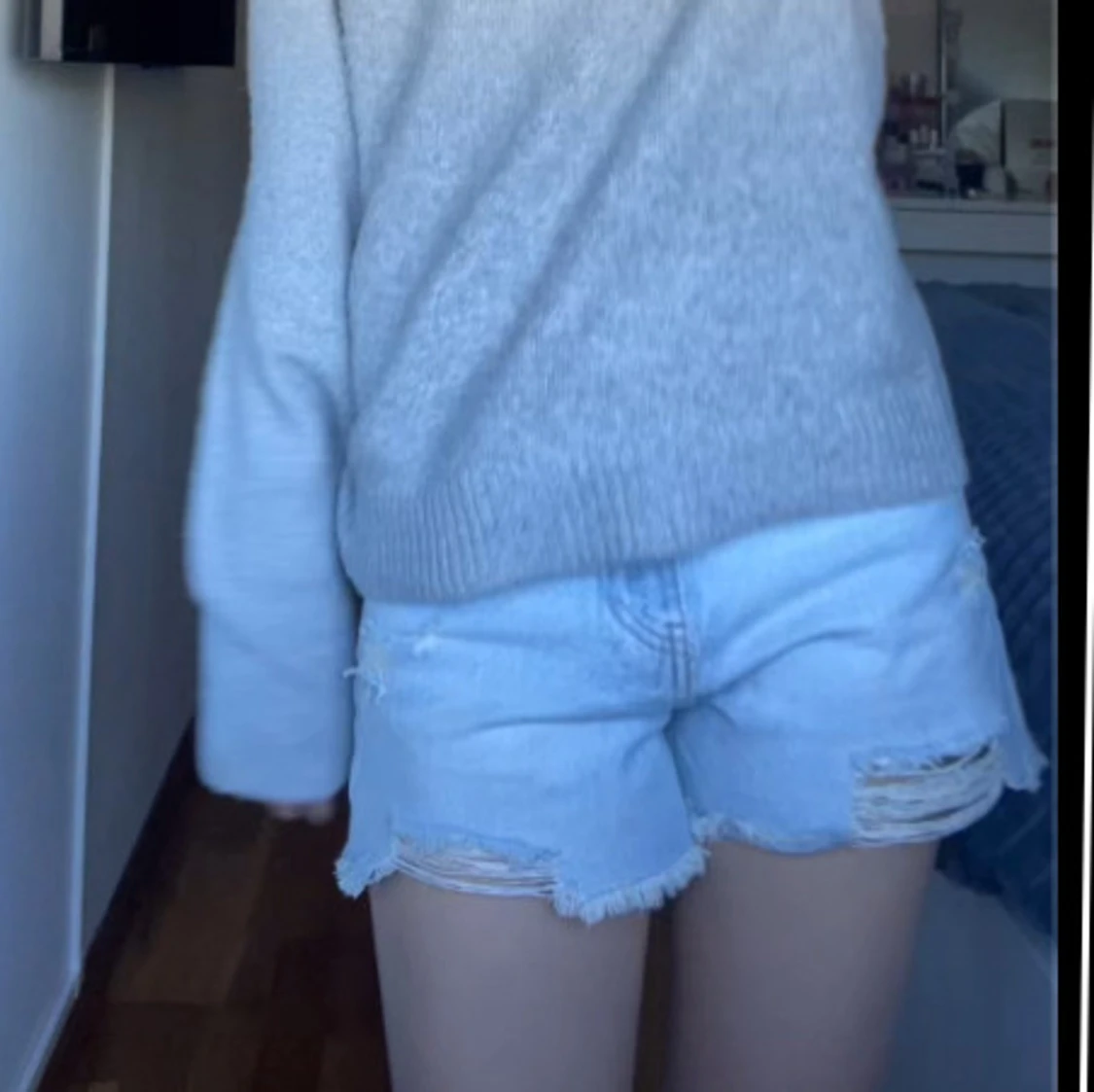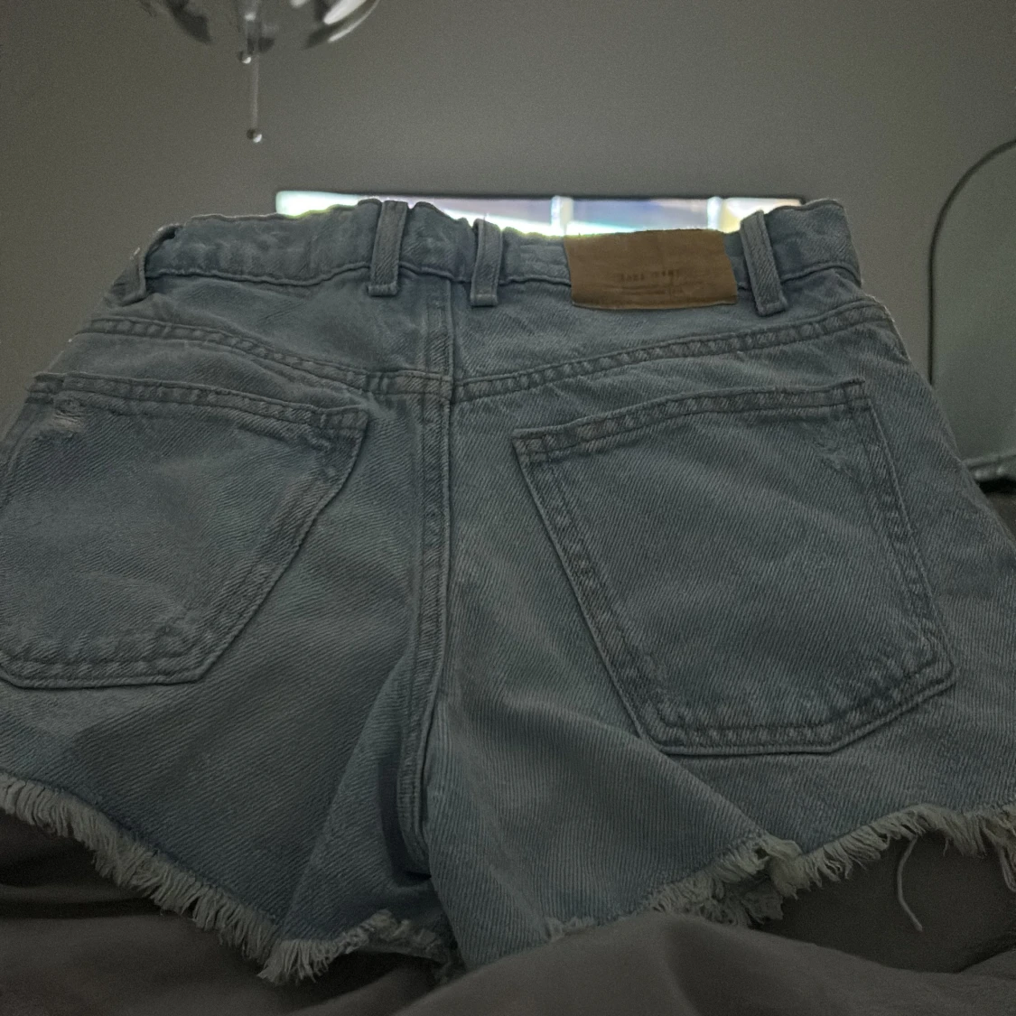 Säljer ett par ljusblå jeansshorts från Zara med fransiga kanter och slitna detaljer framtill.