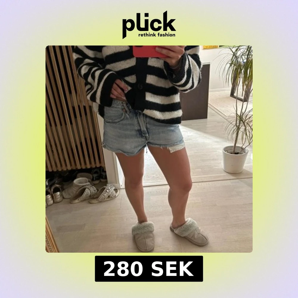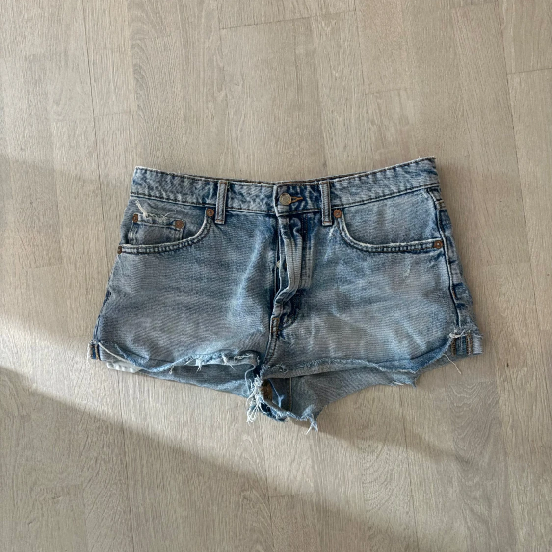 Säljer ett par ljusblå jeansshorts med slitningar från Zara. Shortsen har avslappnad passform och knappgylf. Perfekta för varma dagar!!💕