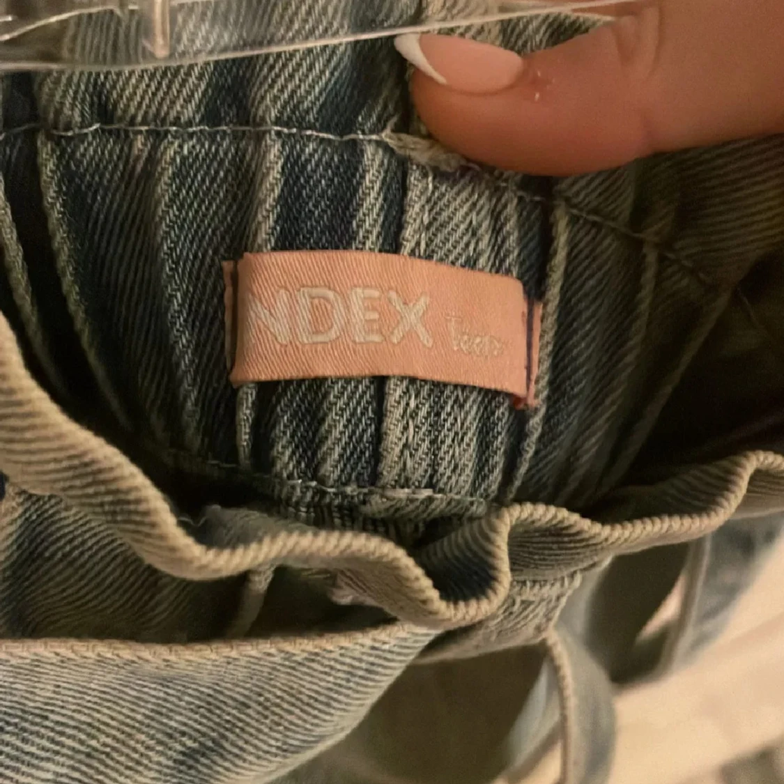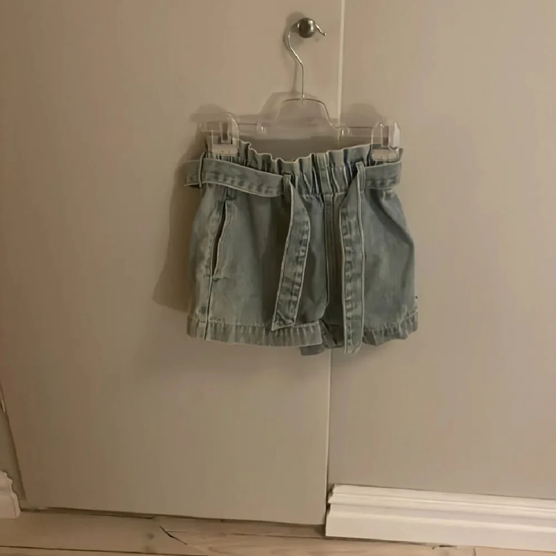 Snygga ljusblå shorts i jeans från Lindex med knytskärp. De har avslappnad passform, rynkad midja och uppvikta benslut. Perfekta för varma dagar och ger en cool vibe till din outfit.