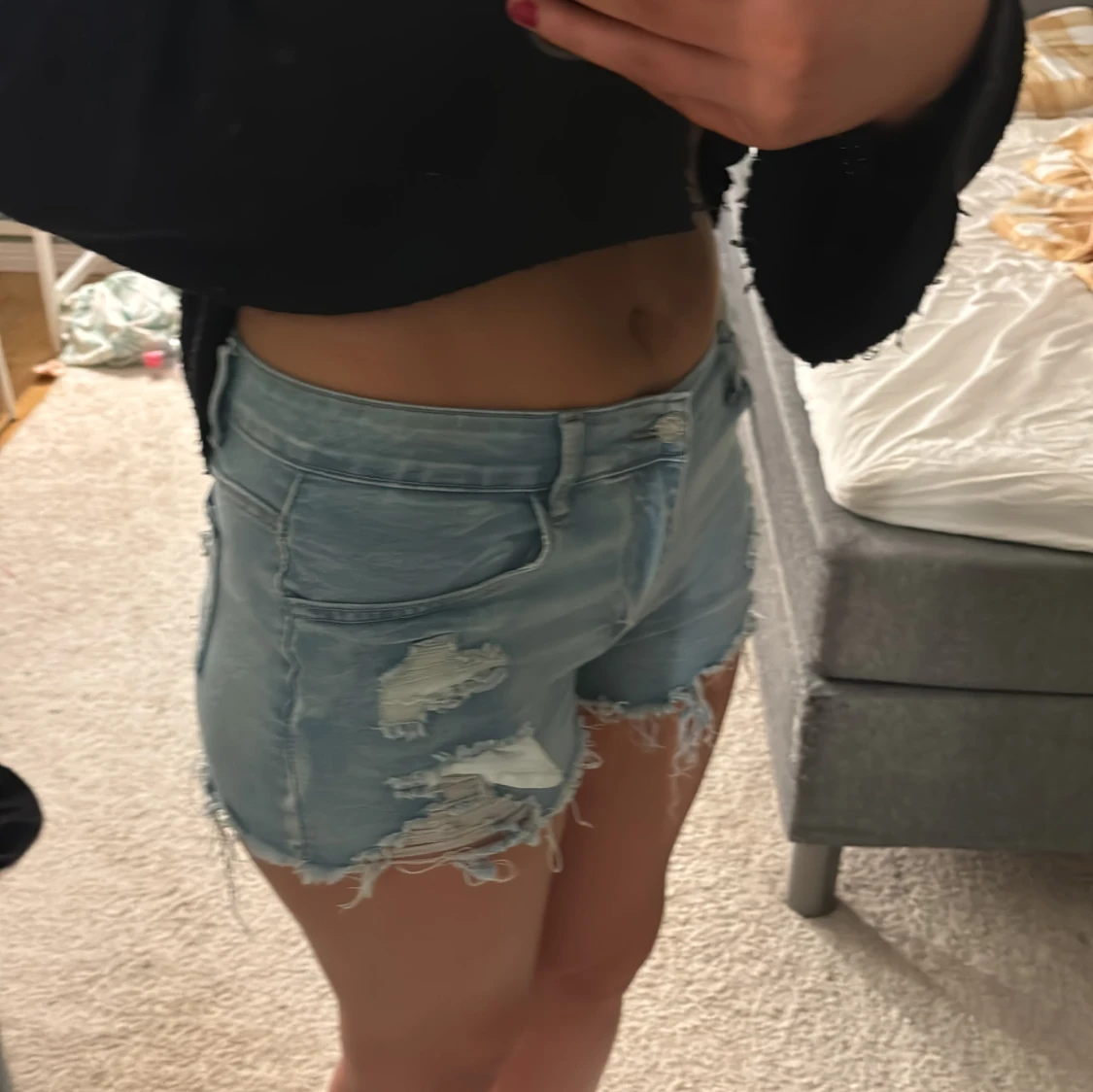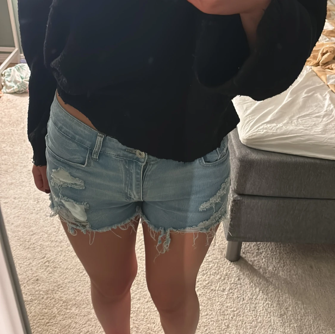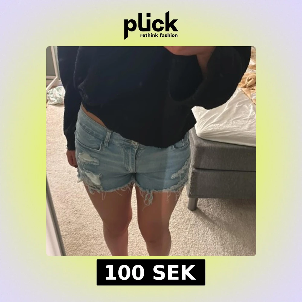 Säljer ett par ljusblå jeansshorts med råa fransar och slitna detaljer framtill och på sidorna. Storleken är M men skulle mer säga det är en S.