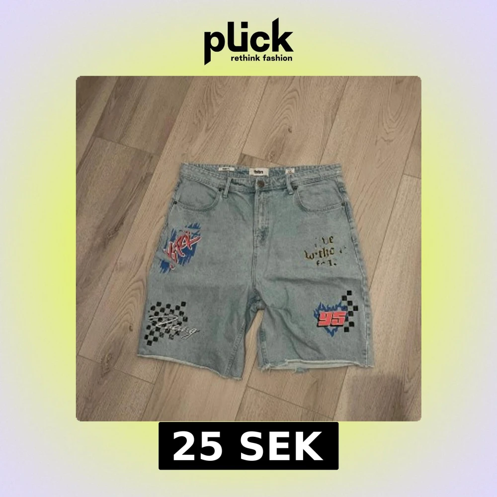 Säljer ett par ljusblå jeansshorts från FSBN med råa benslut och flera coola racinginspirerade tryck i rött, blått, svart och vitt. Shortsen är second hand. Obs! Trycket är lätt att få bort