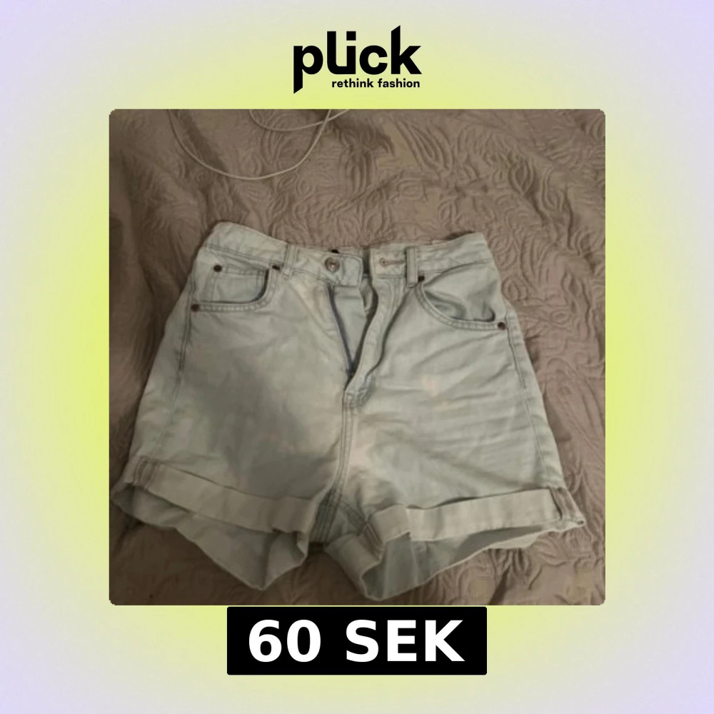 Säljer ett par ljusblå jeansshorts med upprullade benslut och klassisk femficksdesign. Shortsen har knapp- och dragkedjestängning samt bälteshällor. Perfekta för varma dagar!