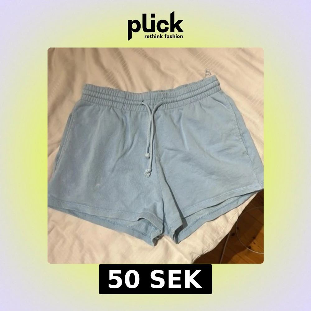 Ljusblåa shorts från Gina Tricot med elastisk midja och snörning. De är tillverkade i mjuk bomull och har en loose fit som gör dem perfekta för varma dagar. Enkla att matcha och riktigt sköna att ha på sig hela sommaren (eller att sova i). De har blivit lite missfärgade men inget som syns särskilt mycket.