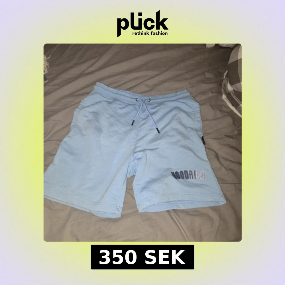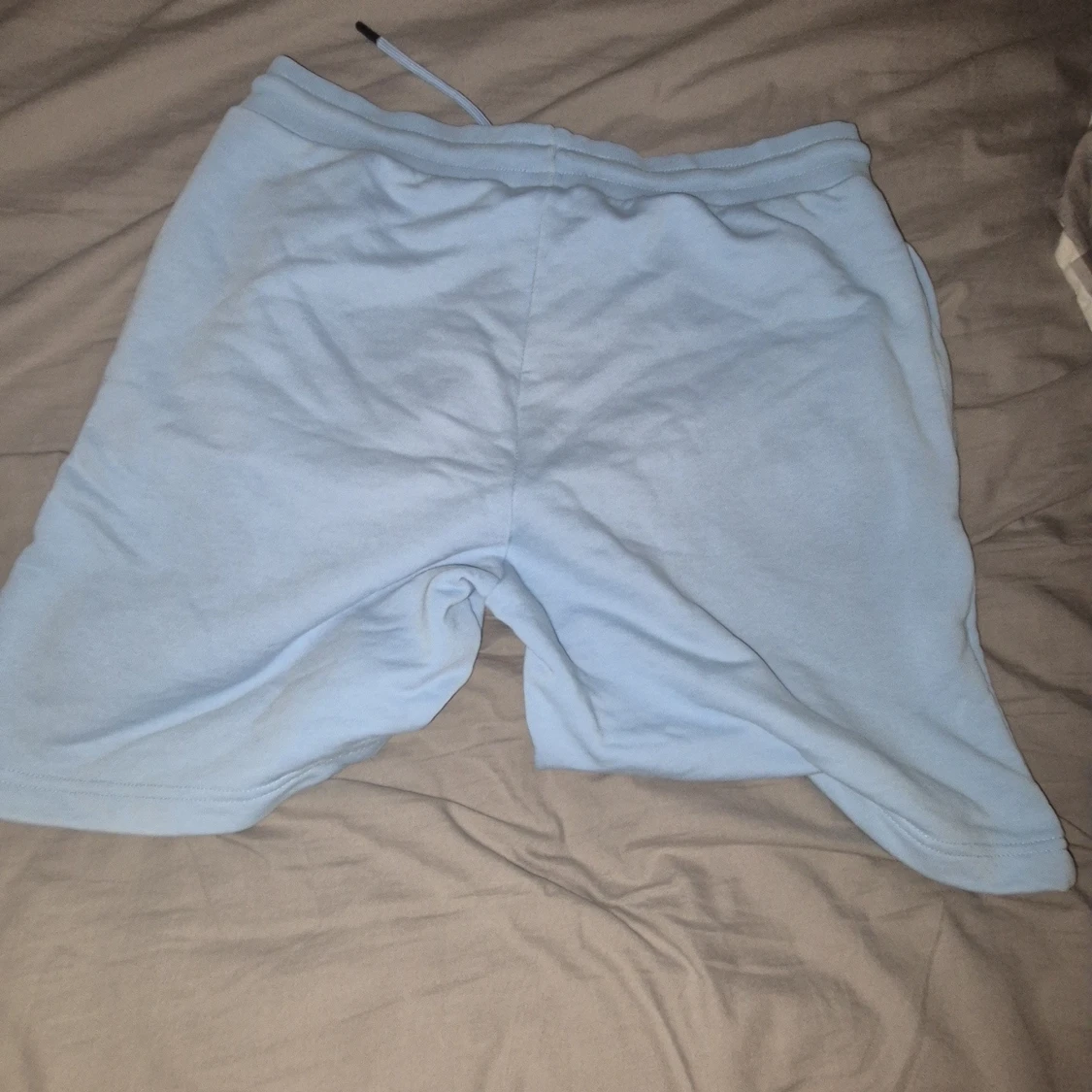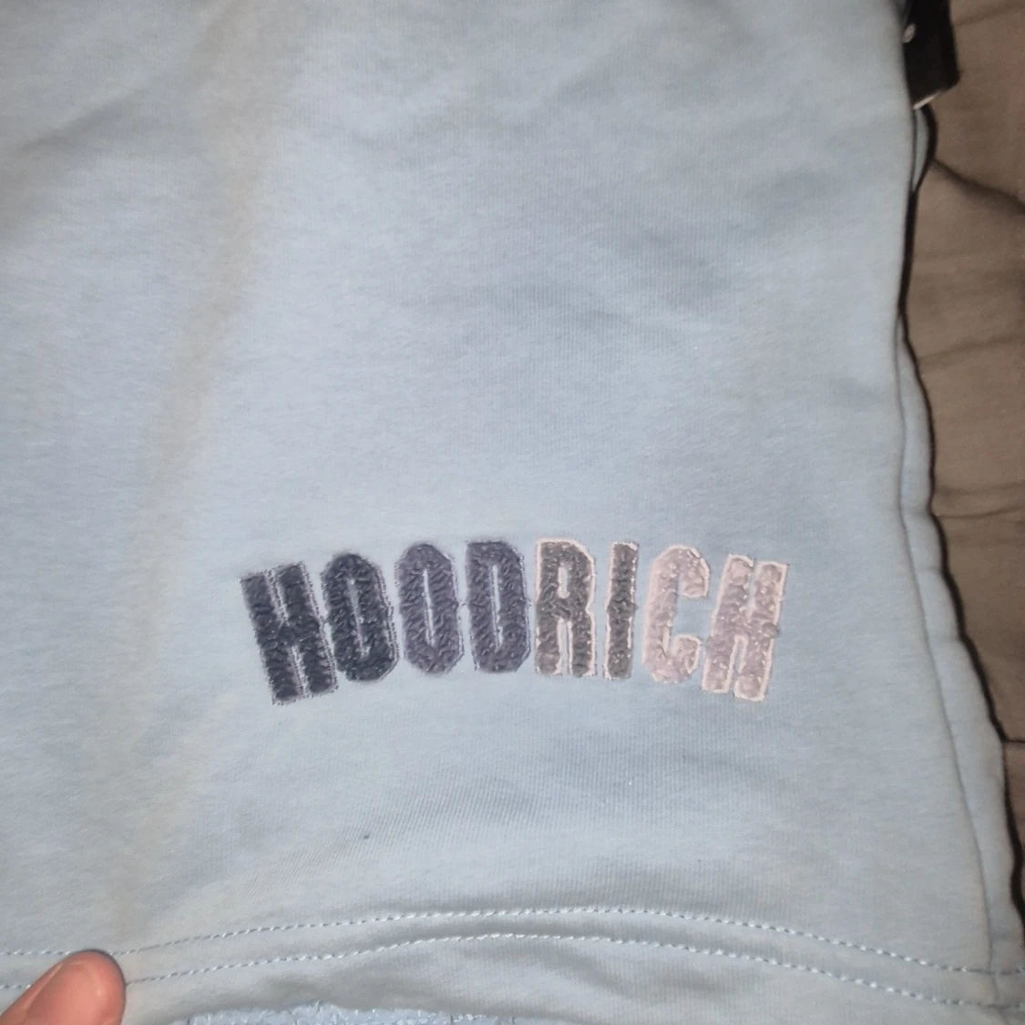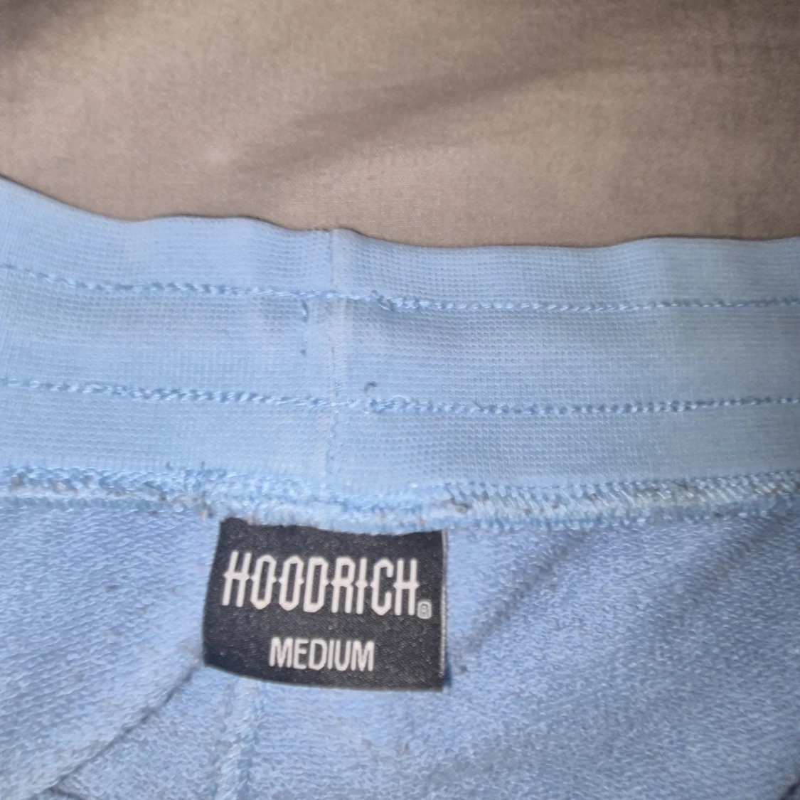 Säljer ett par ljusblå shorts från Hoodrich i mjuk bomull med broderad logga på ena benet. Shortsen har snörning i midjan och en avslappnad passform, perfekta för chill dagar. Snygg och enkel design som är lätt att matcha.