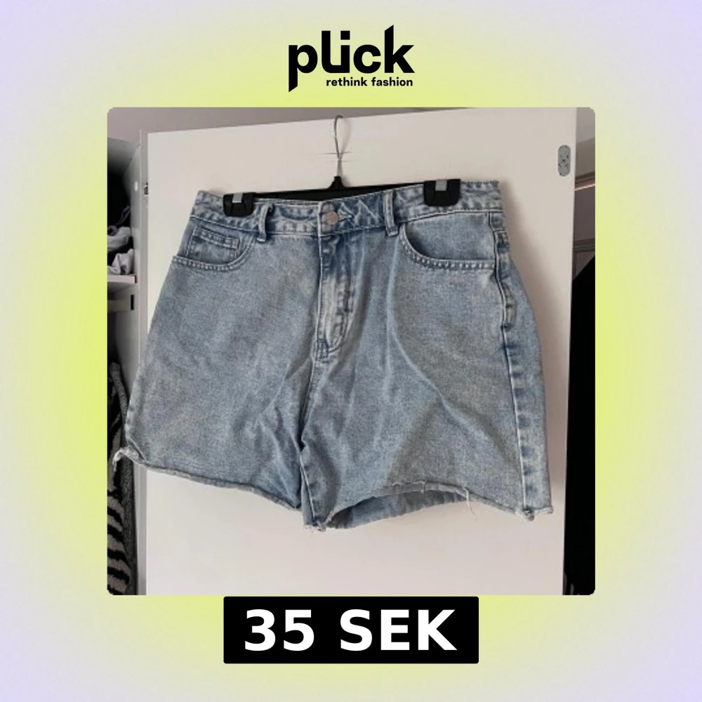 Ljusblåa jeansshorts med hög midja och avslappnad passform. Klassisk femficksmodell med råa, fransiga benslut. Perfekta för varma dagar och enkel att matcha med allt. Dragkedja och knapp framtill, bälteshällor och bakfickor. Önskar du veta exakta mått? Tveka inte att höra av dig!