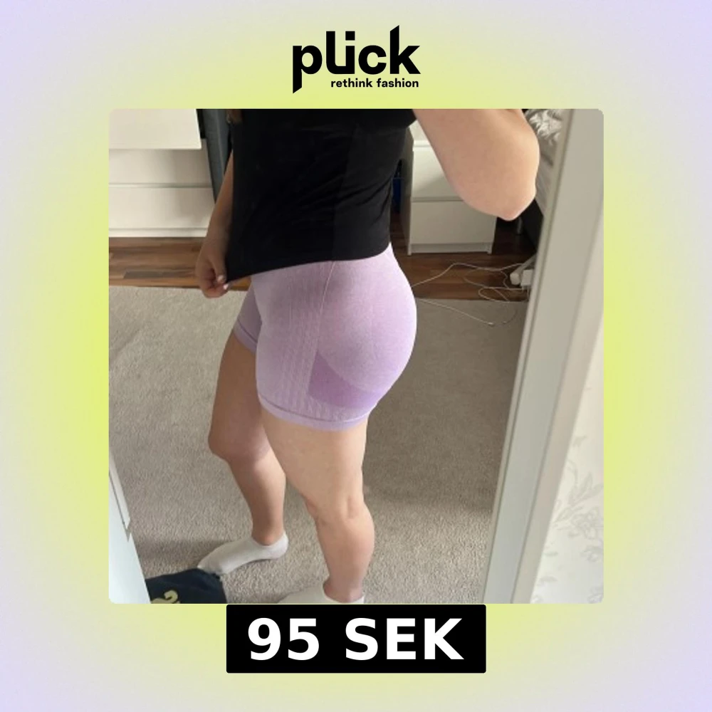 Säljer ett par ljuslila seamless shorts med hög midja och tight passform. Shortsen är tillverkade i ett stretchigt syntetmaterial och har ribbade detaljer i midjan samt diskret scrunch baktill för extra form. Lånade bilder eftersom de va för stora på mig.