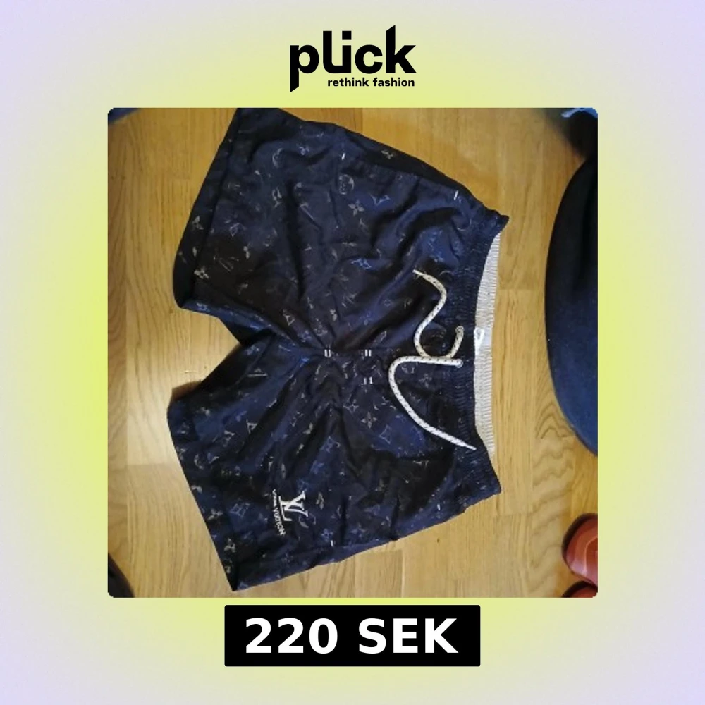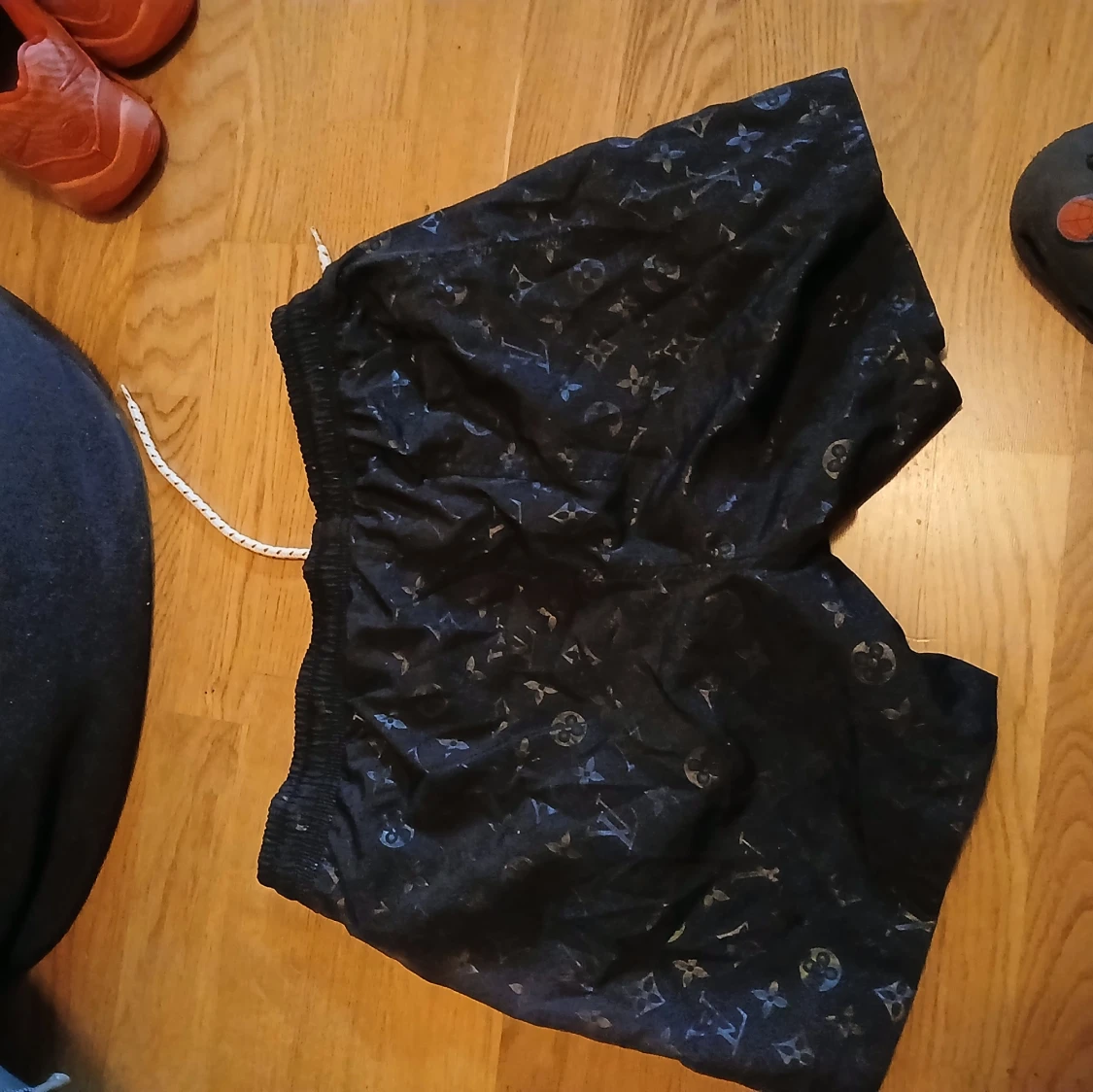 Svarta shorts från Louis Vuitton med ikoniskt monogrammönster över hela tyget. De har elastisk midja med vit snörning och är tillverkade i ett lätt material som passar perfekt för sommaren. Stilen är loose och de har en sportig vibe.
