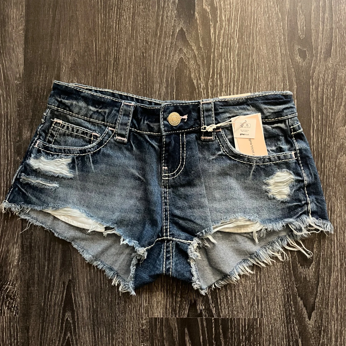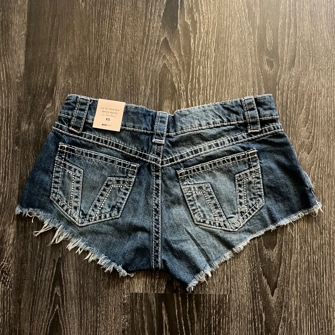 Säljer mina helt nya mörkblå denimshorts med låg midja från gina tricot 14+ då dom är förstora och därför inte kommit till någon användning. Dom har även kvar sina båda lappar och de har detaljer på fickorna, en fransig kant och slitna detaljer. Nypris 299 därför priset nu men de kan såklart diskuteras❣️
