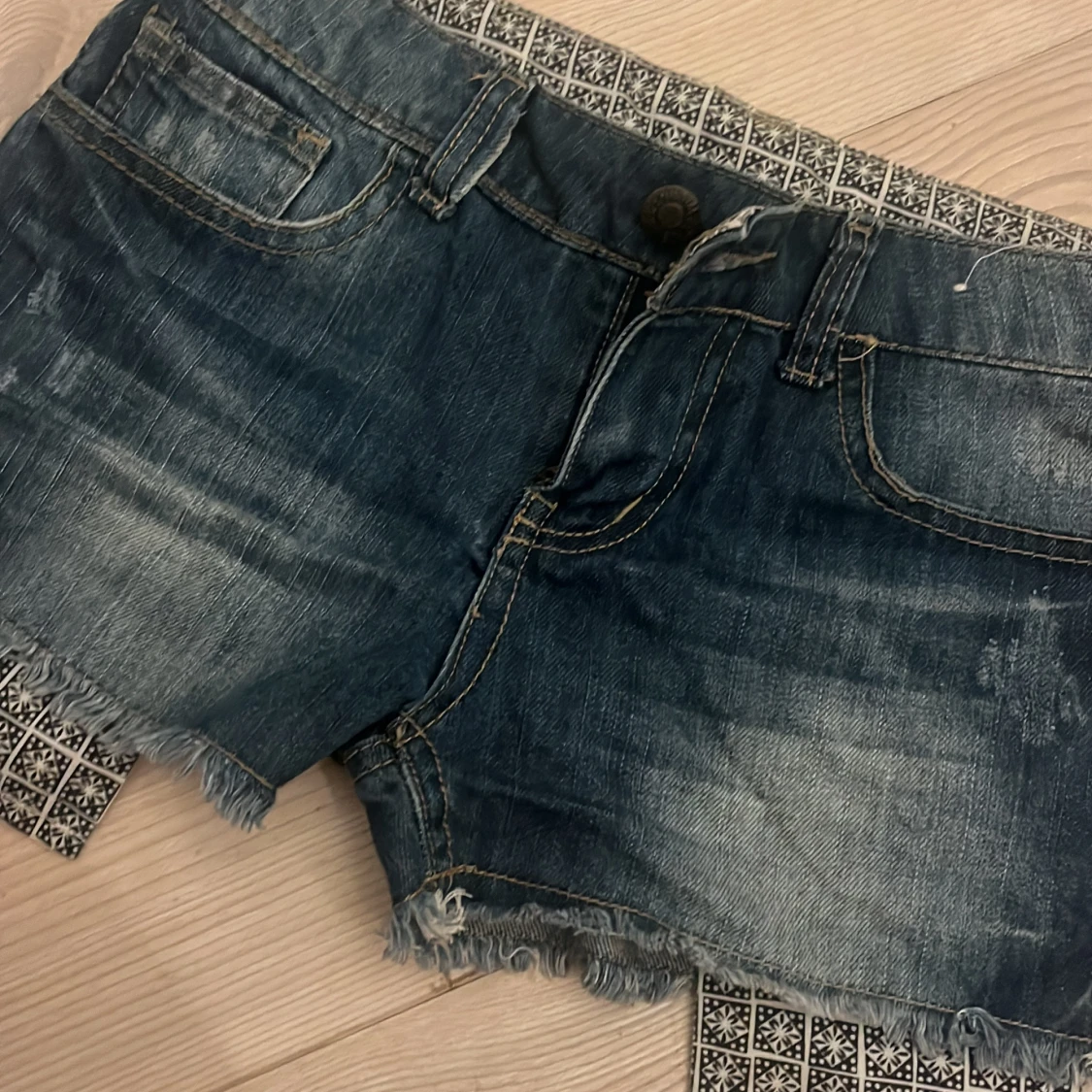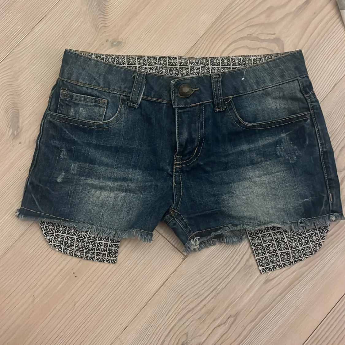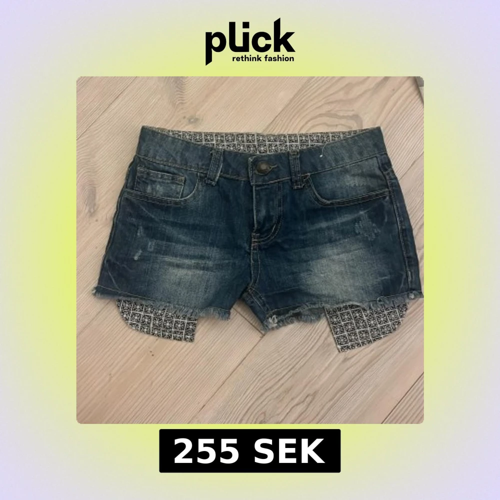 säljer dessa snygga jeans shorts som är både low waist och har slitningar och ett fint mönster på insidan🫶 ps. ( är inte säker på märket men det ståg typ nåt med denim co)❤️