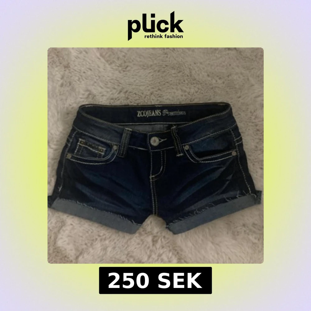 Snygga mörkblå jeansshorts från ZCOJEANS med uppvikta benslut och dekorativa vingdetaljer i guld och silver på bakfickorna. Klassisk femficksmodell med knapp och dragkedja framtill. Perfekta för sommardagar! Köpt på plick💕