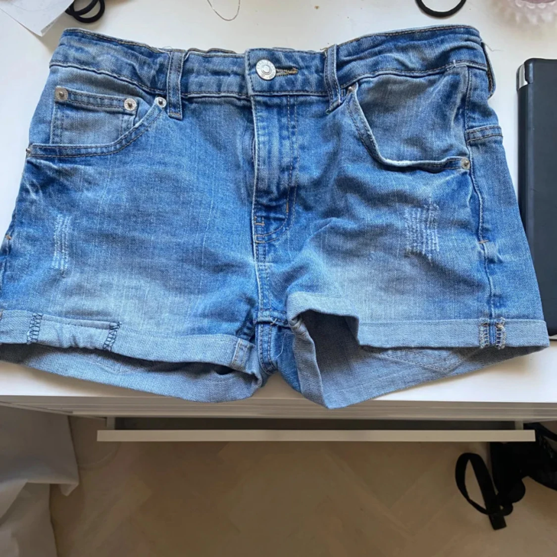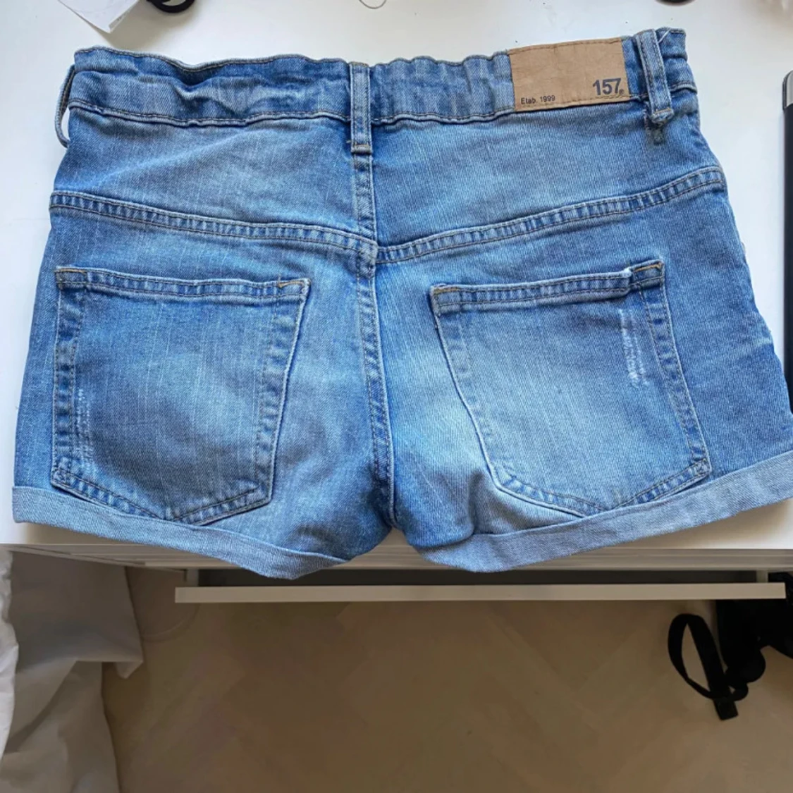 Snygga blå jeansshorts med klassisk femficksdesign och knappgylf. Perfekta för en avslappnad stil. De har en lätt tvättad look och är bekväma att bära.