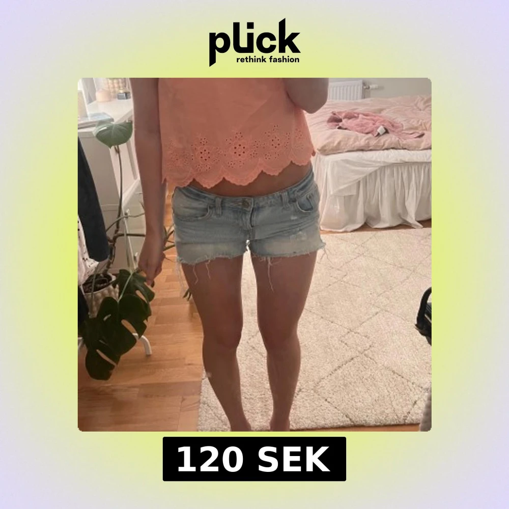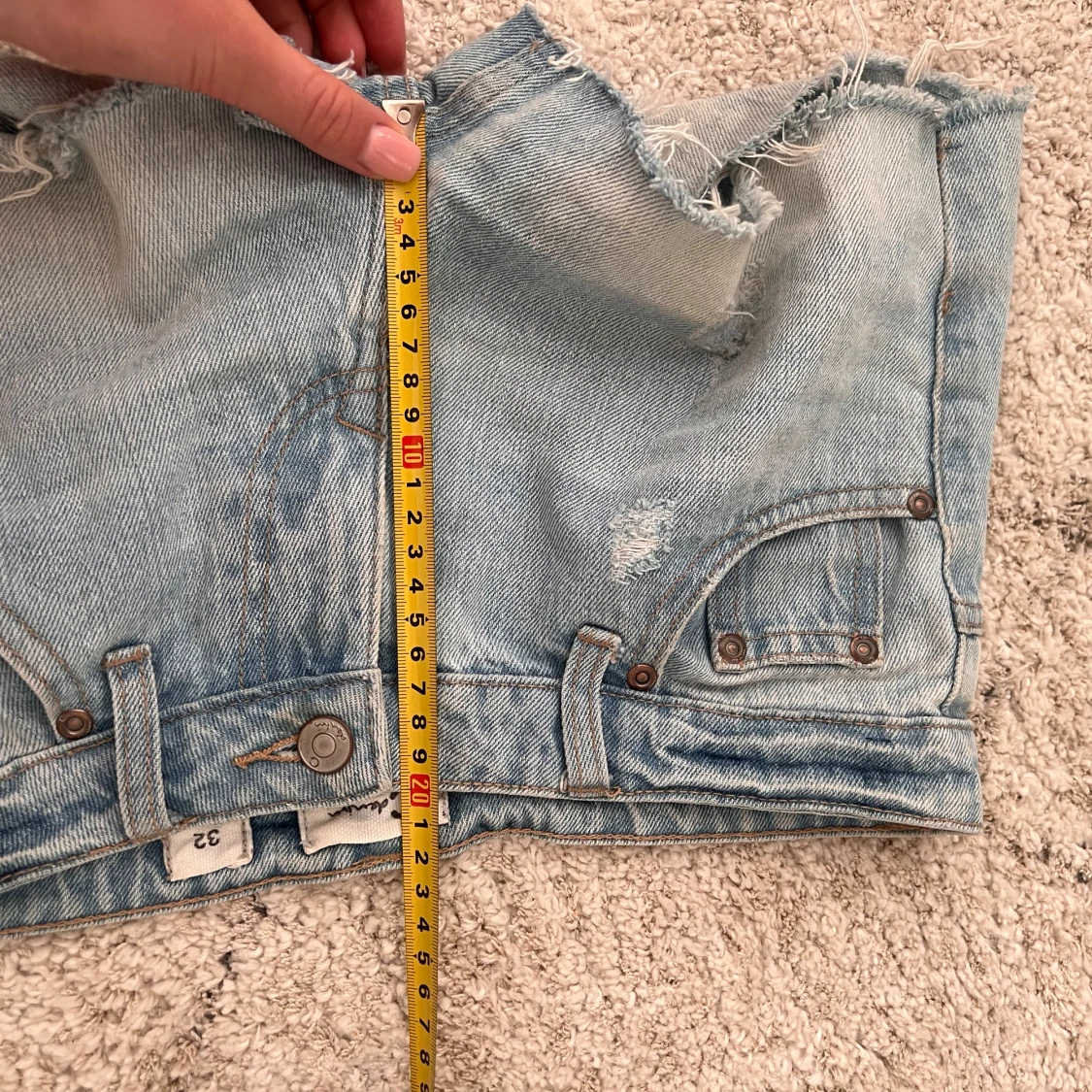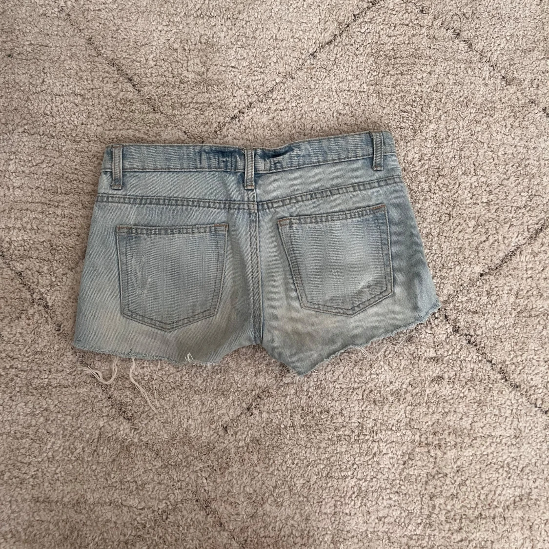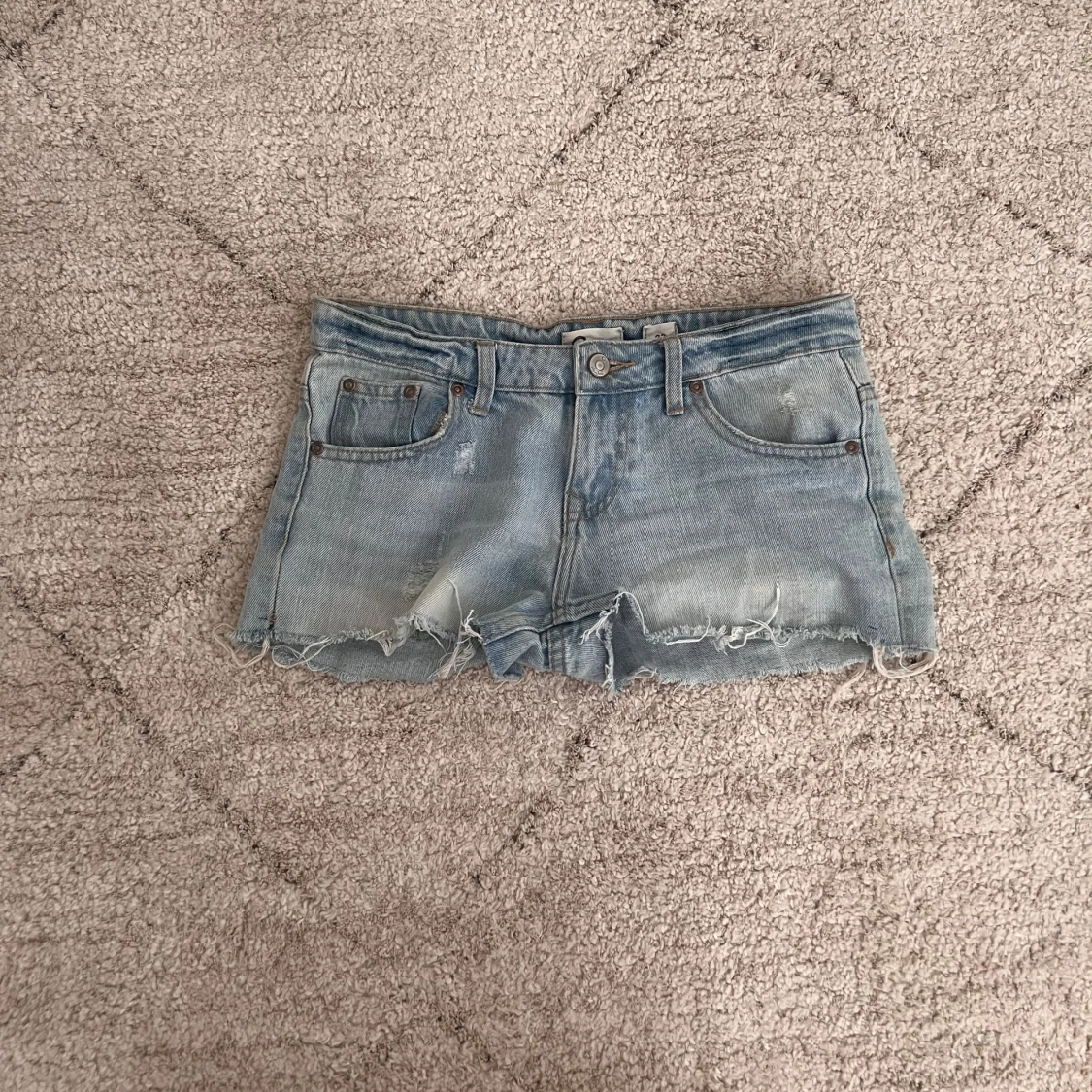 Supersnygga ljusblå lågmidjade jeansshorts i mycket bra skick! Det stor storlek 32 i shortsen men de passar mig som vanligtvis har st 34-36, måtten finns bland bilderna💞