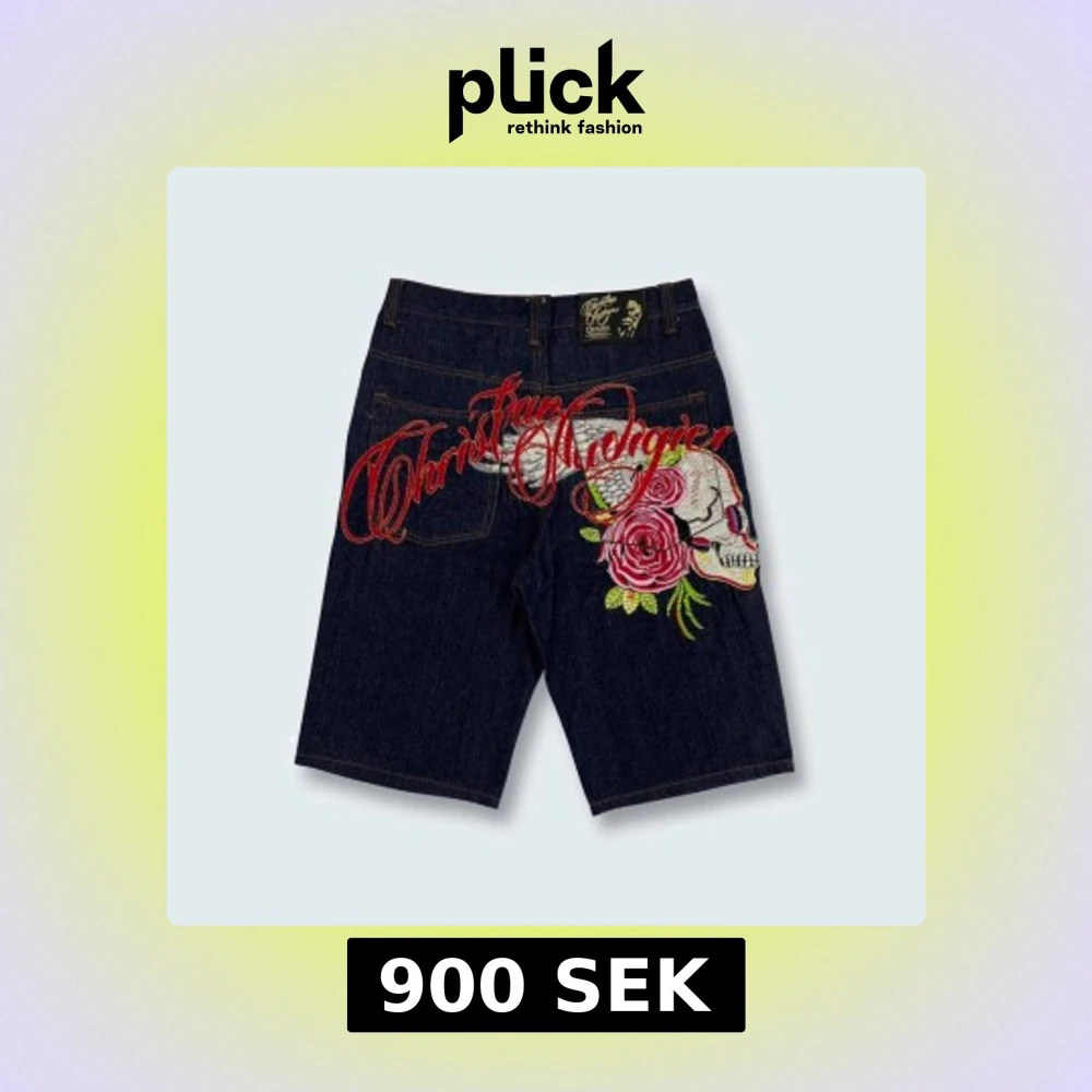 Unika mörkblå jeansshorts från Christian Audigier med fet broderad design på baksidan – döskalle, röda rosor och stora röda bokstäver. Klassisk femficksmodell, gul logga i midjan och detaljerade sömmar. Perfekt för dig som vill sticka ut.