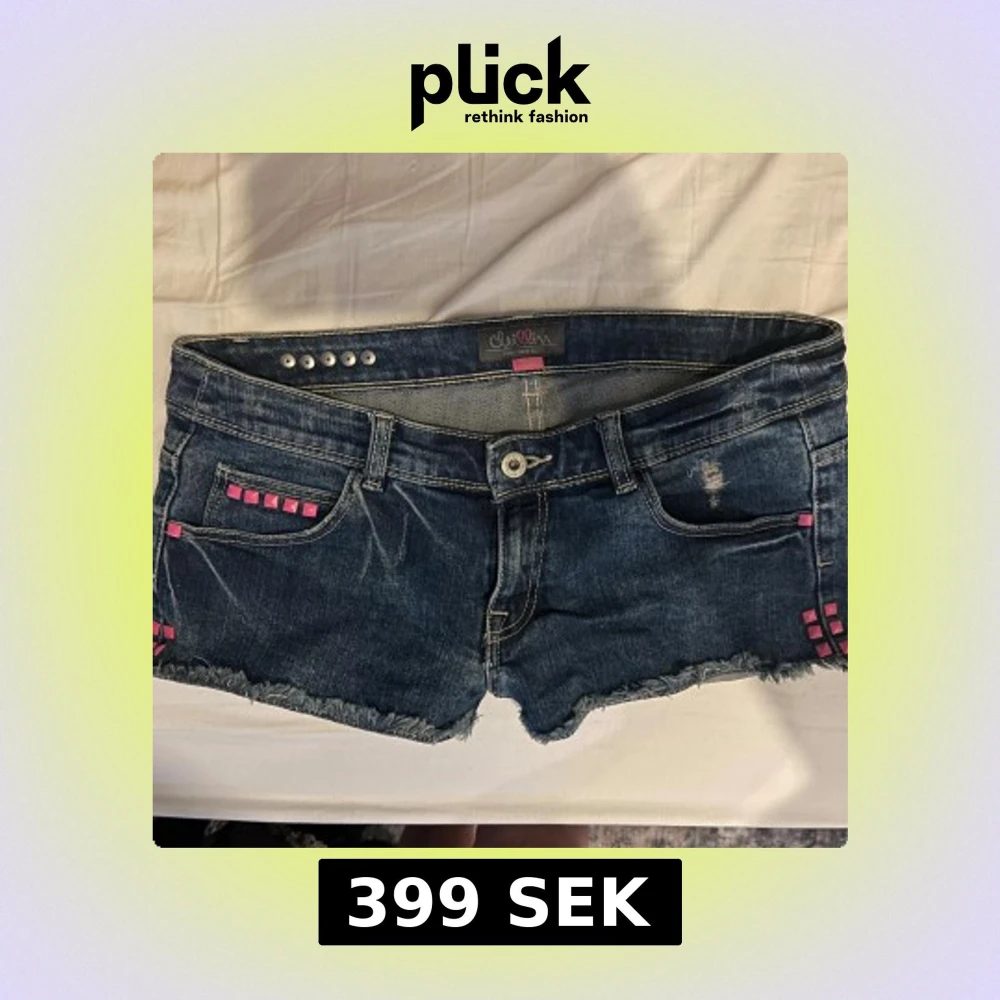 Unika jeansshorts med rosa nitar och låg midja. Se bild 3 för midjemått. Shortsen är i mycket bra skick. Se sista 2 bilderna för bättre ljus.