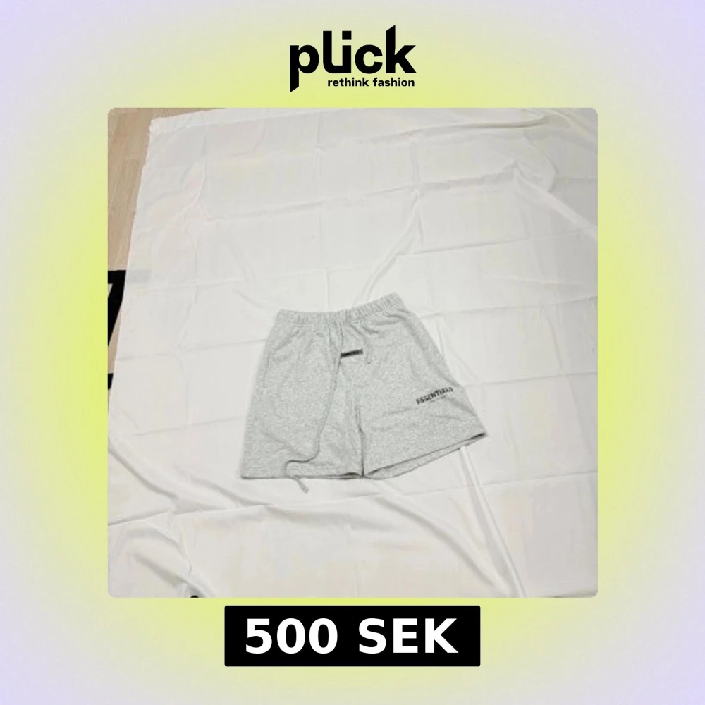Snygga ljusgrå shorts från Essentials Fear of God med elastisk midja och snörning. Mjukt bomullsmaterial, två sidofickor och en bakficka. Diskret logga framtill och patch-detalj. Perfekta för chill eller streetwear.