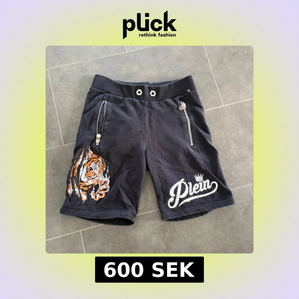 Svarta shorts från Philipp Plein med broderad tiger i orange och vitt på ena benet och stort Plein-tryck på det andra. Shorts med bred resår i midjan, dragkedjor med dödskalle-detaljer och coola silvriga detaljer. Perfekta för dig som vill sticka ut med streetstyle.