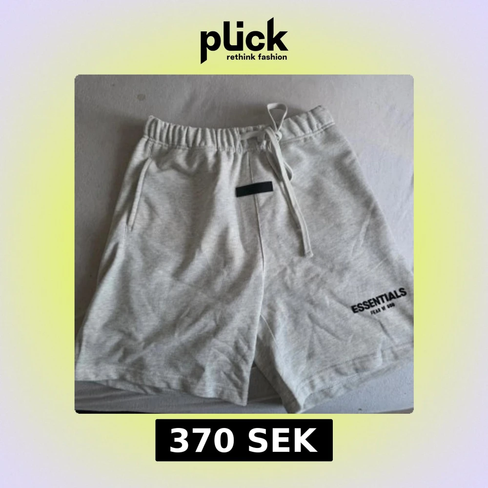 Säljer ett par ljusgrå shorts från Essentials Fear of God med snörning i midjan och tryckt logga på benet. Shortsen har elastisk midja och sidofickor, perfekta för en avslappnad stil.