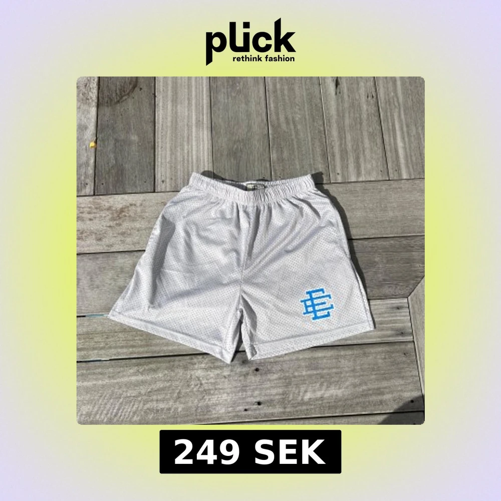 Snygga grå meshshorts från Eric Emanuel med blå logga. Shortsen har elastisk midja och är tillverkade i luftig mesh, perfekta för varma dagar eller sport. Klassisk loose fit och sportig vibe. Storlek: M men passar som S. Längd: 43cm