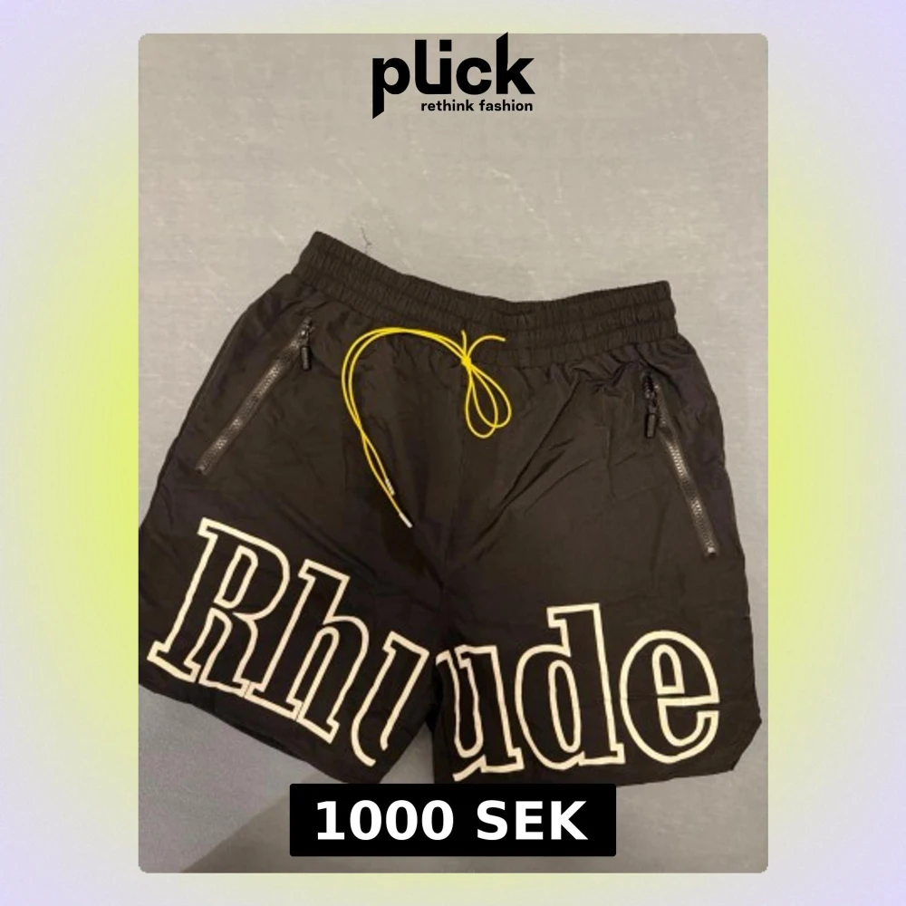 Säljer ett par svarta shorts från Rhude i storlek M. De har stor vit logga framtill, gul snörning i midjan och dragkedjeförsedda fickor. Tillverkade i lätt syntetmaterial med meshfoder för extra komfort. Perfekta för en streetwear-look.