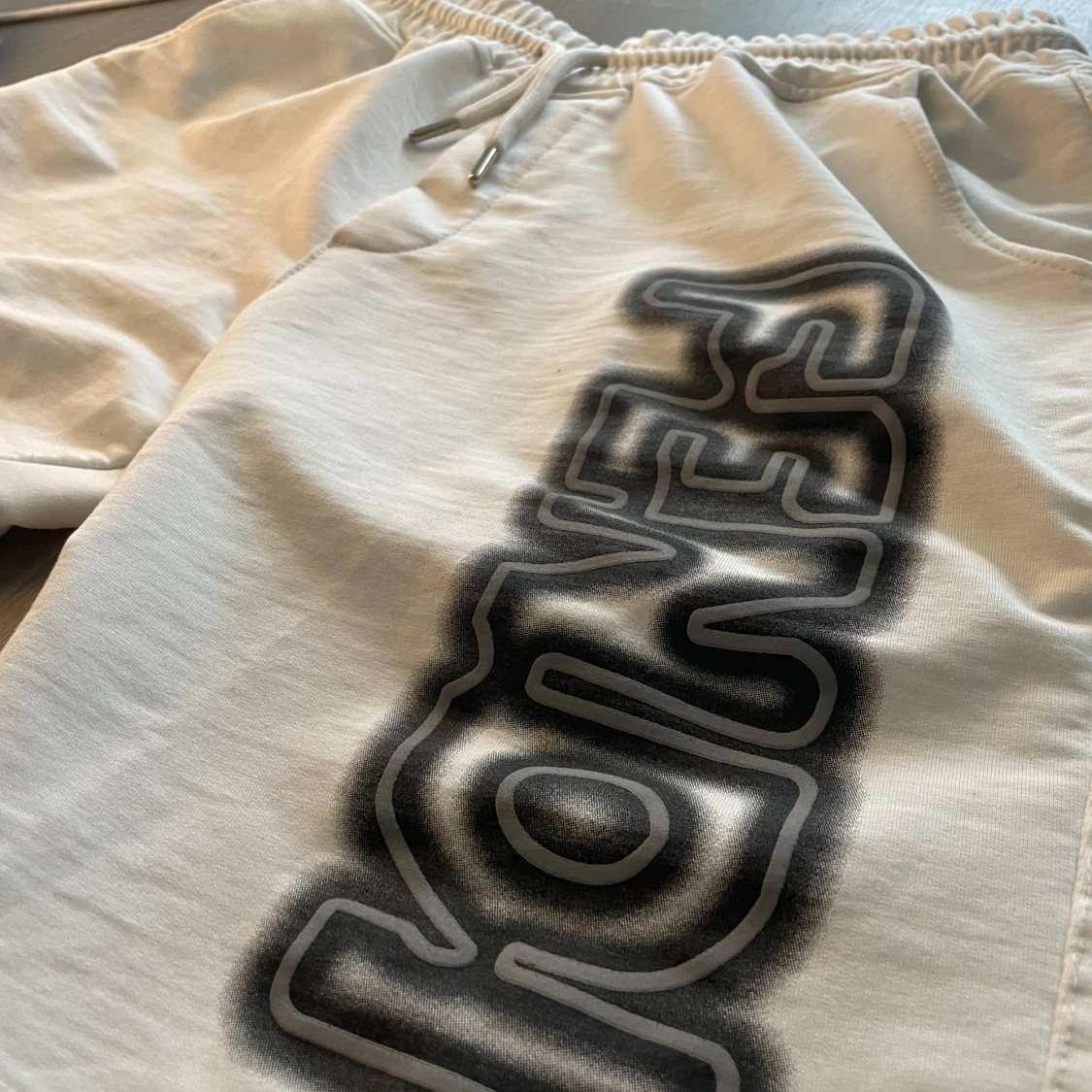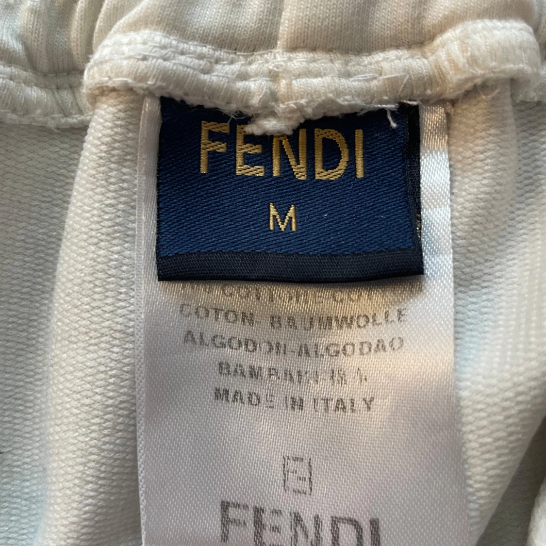 Snygga vita shorts från Fendi i bomull med elastisk midja och snörning. Stora Fendi-loggan i svart och grått tryck längs ena benet ger en cool streetkänsla. Perfekta för sommaren och chill dagar. Två sidofickor och relaxed fit.