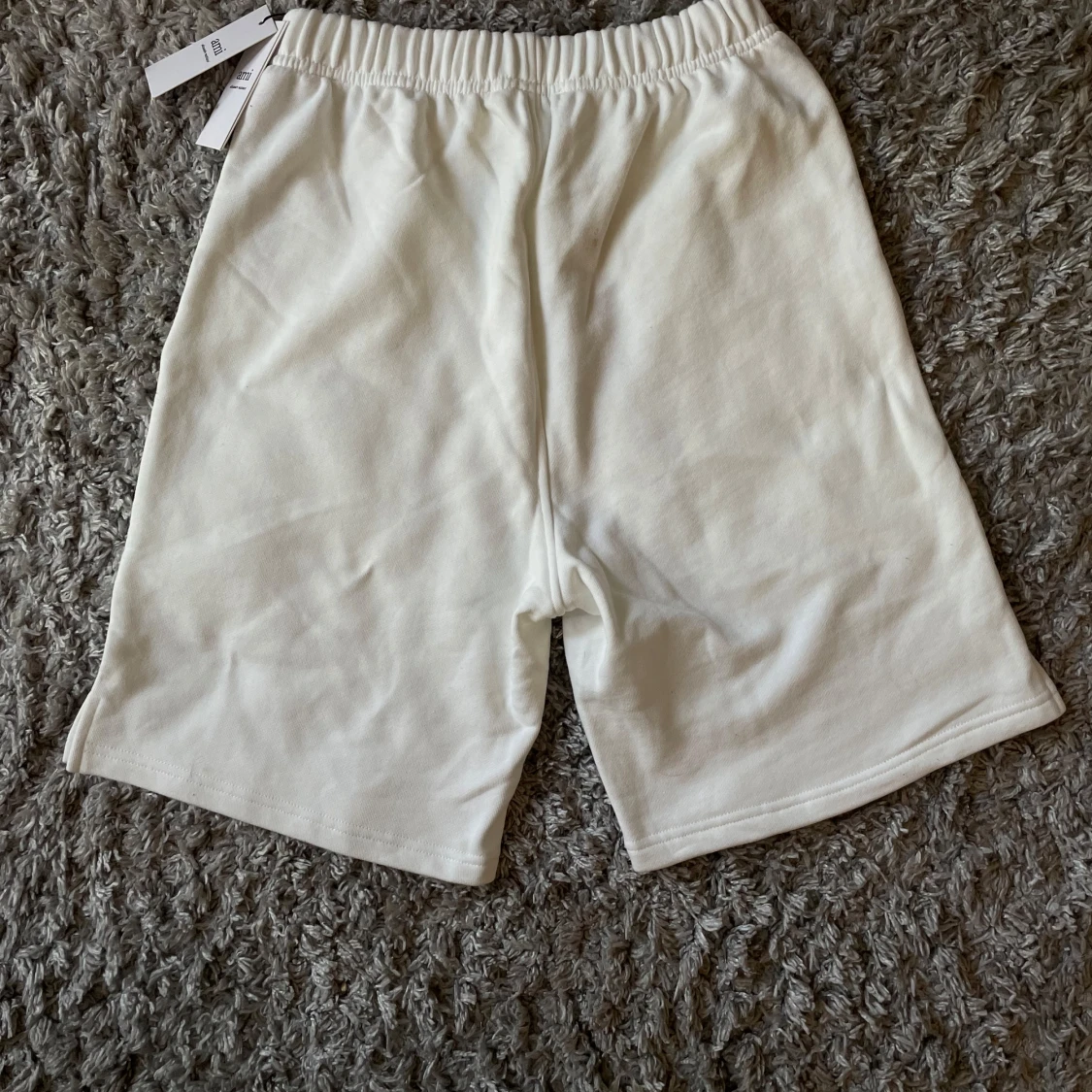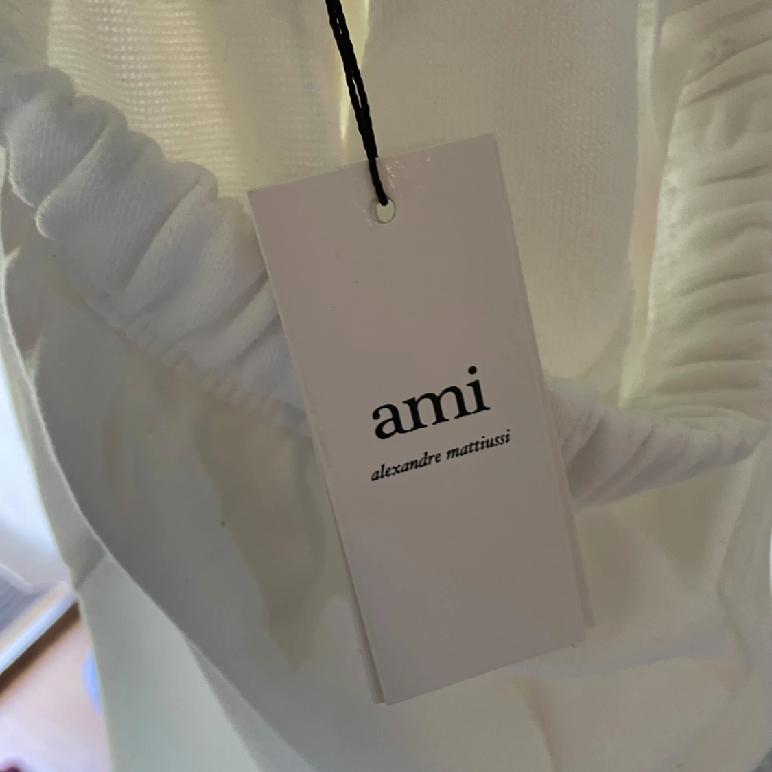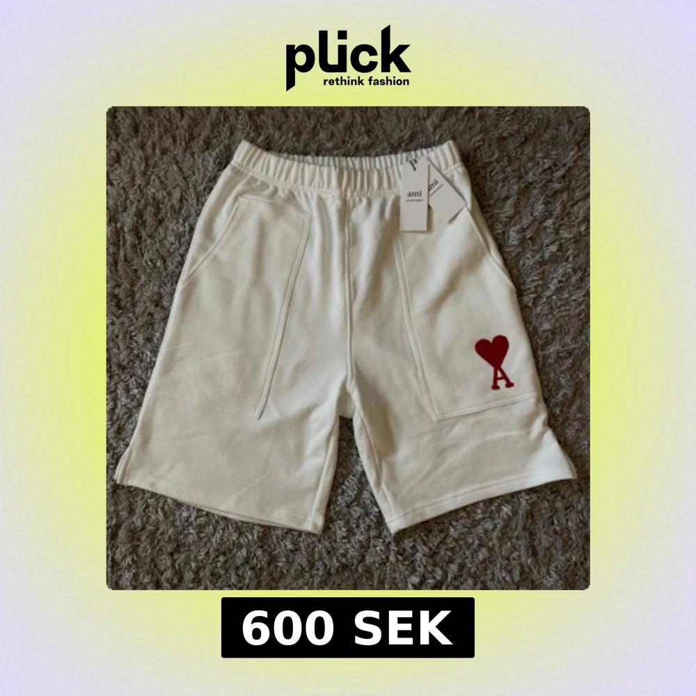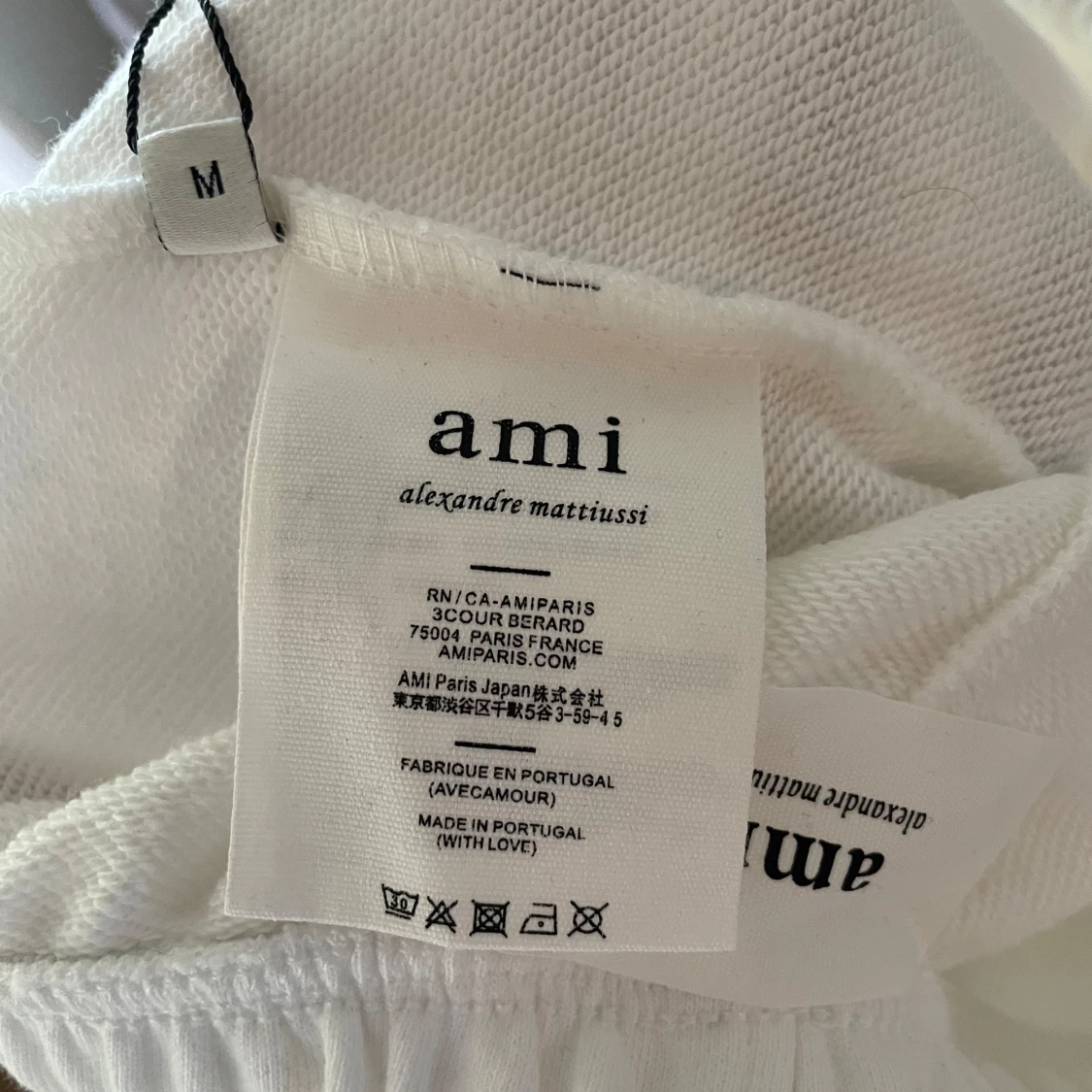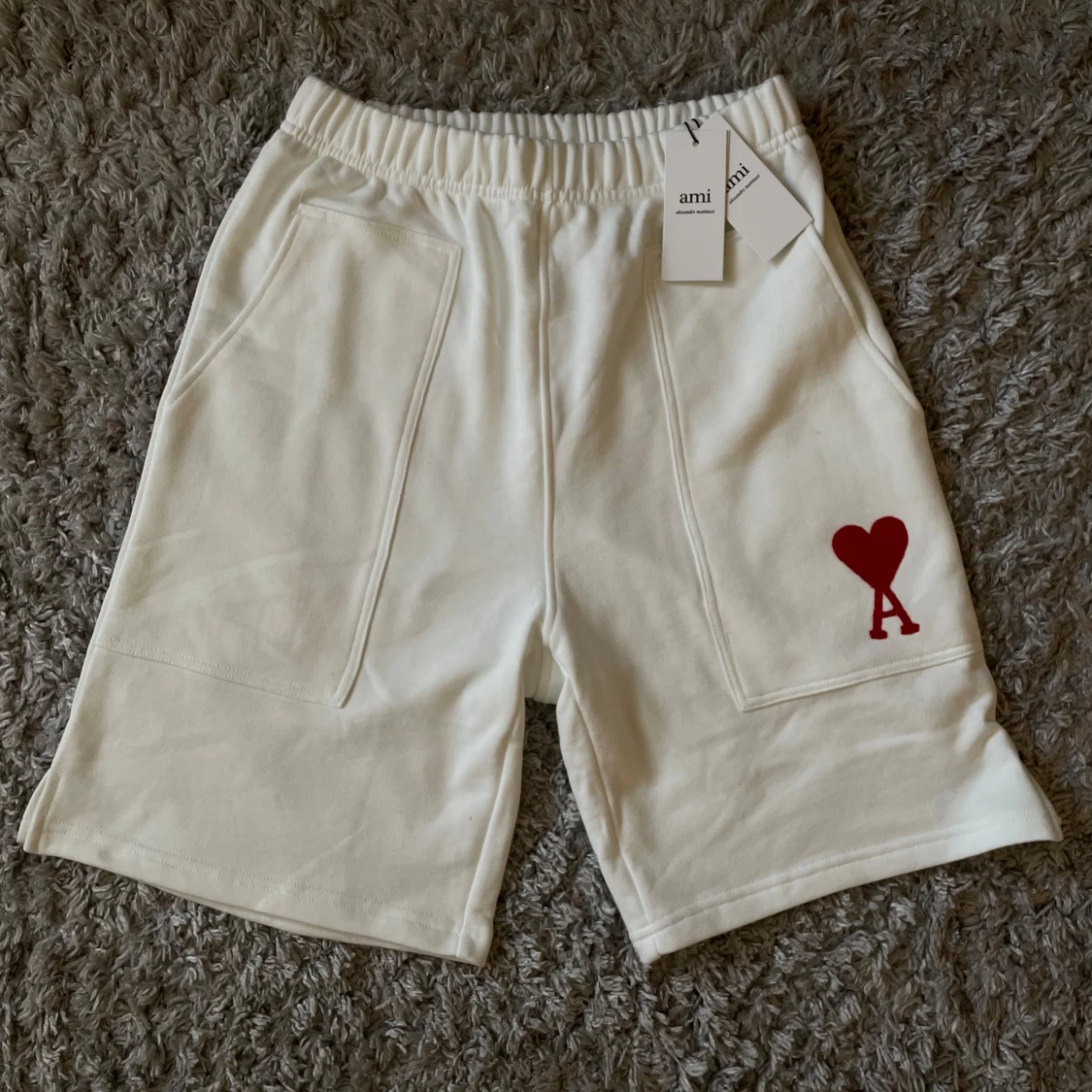 Snygga vita shorts från Ami Paris med elastisk midja och två stora fickor framtill. På vänster ben finns en röd broderad hjärtdetalj med bokstaven A. Tillverkade i mjuk bomull, perfekta för sommardagar. Enkel och clean design som sticker ut med den ikoniska loggan.