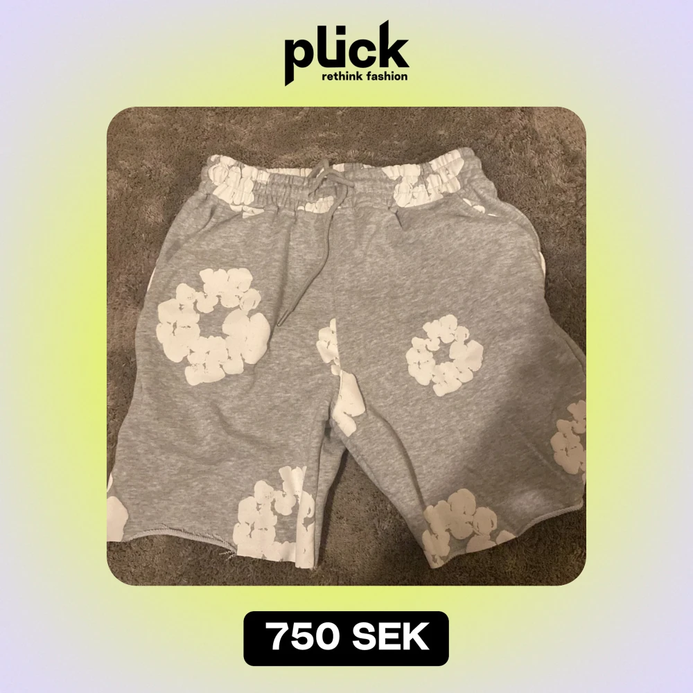 Säljer ett par grå shorts från Denim Tears i storlek M. De har ett coolt vitt blommönster och snörning i midjan för perfekt passform. Perfekta för en avslappnad sommarstil! 🌼