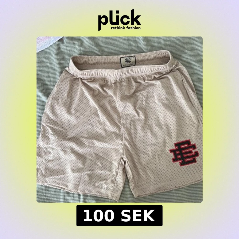 Snygga beige mesh shorts från EE med svart och röd broderad logga på benet. Luftigt material och elastisk midja för skön passform. Perfekta för chill eller sportiga dagar, riktigt clean look och lätt att matcha med hoodies eller t-shirts.