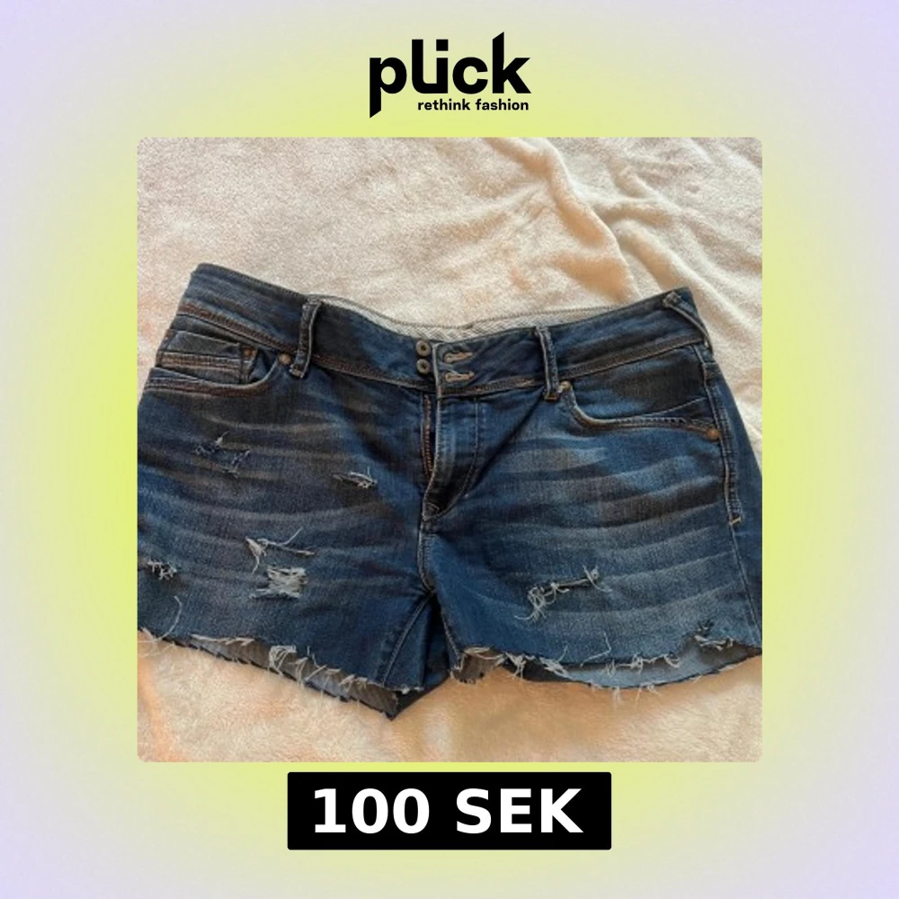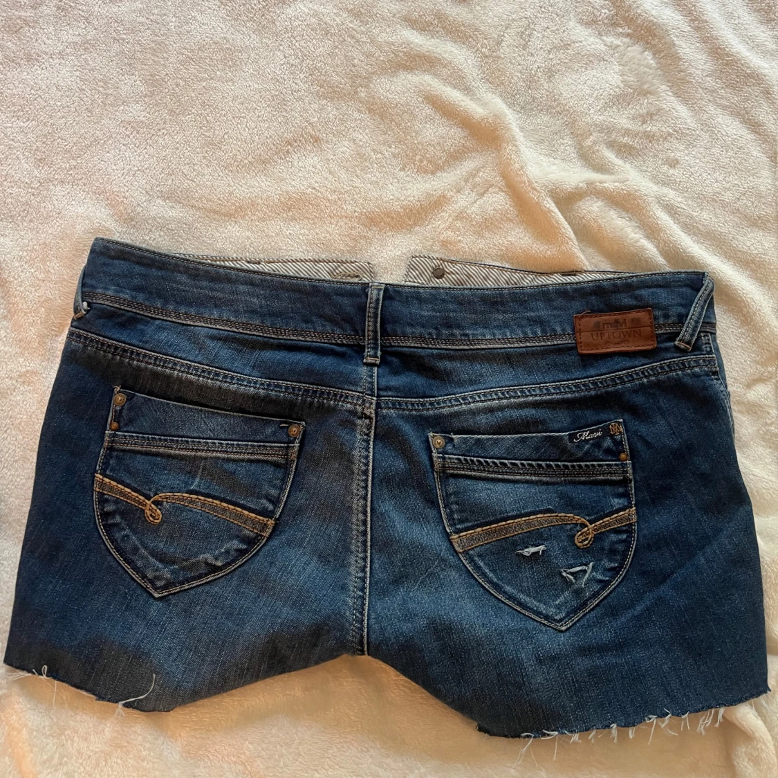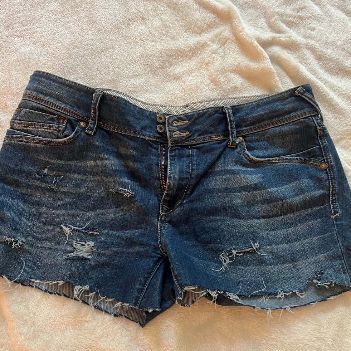 Säljer ett par mörkblå jeansshorts med slitna detaljer och fransig kant nertill. Shortsen har klassisk femficksdesign, dubbla knappar i midjan och snygga slitningar både fram och bak. Perfekta för sommardagar!