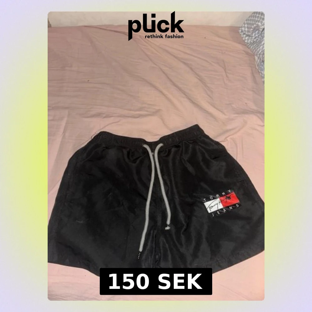 Säljer ett par svarta shorts från Tommy Jeans med klassisk logga på benet. De har elastisk midja och grå snörning framtill. Materialet känns lätt och snabbtorkande, perfekt för sommardagar. Snygg och enkel design som funkar till det mesta.