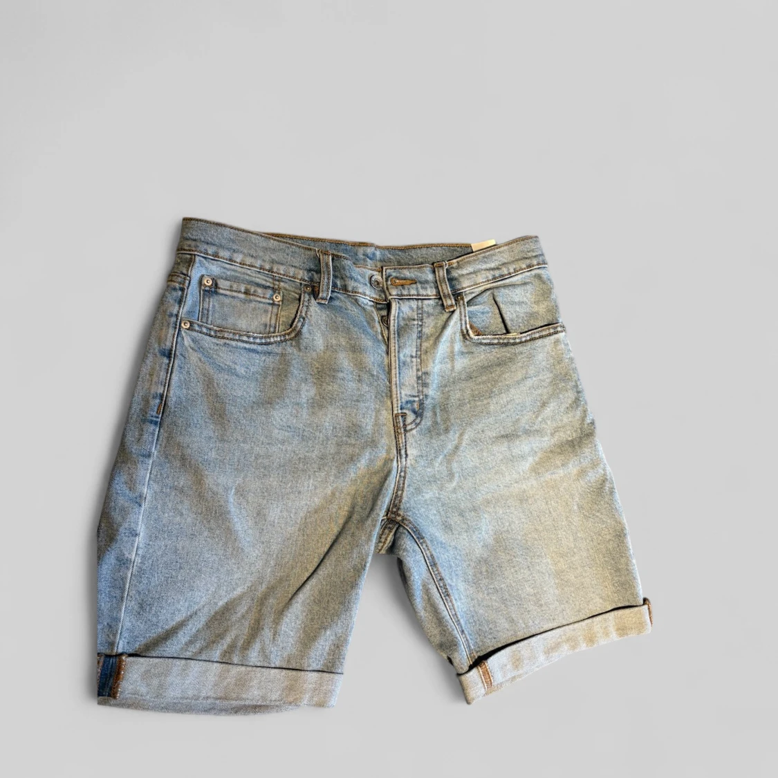 Snygga ljusblå jeansshorts med klassisk femficksdesign och uppvikta benslut. Shortsen har bälteshällor och dragkedja med knapp framtill. Perfekta för varma dagar när du vill ha en avslappnad och stilren look.